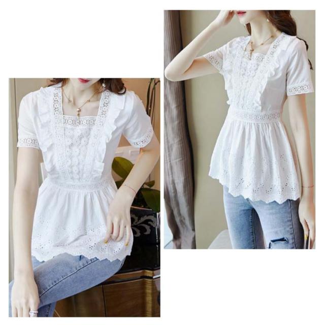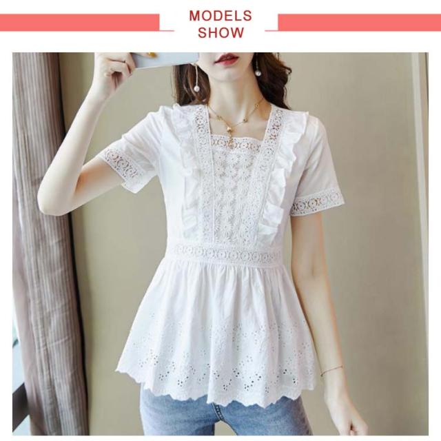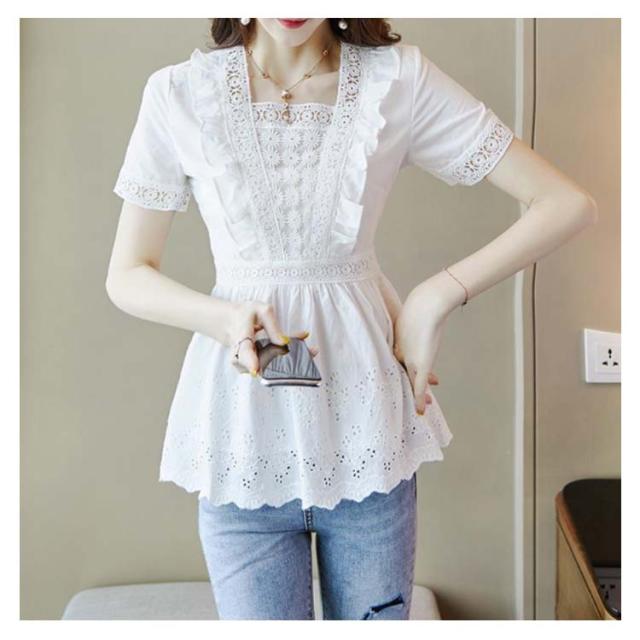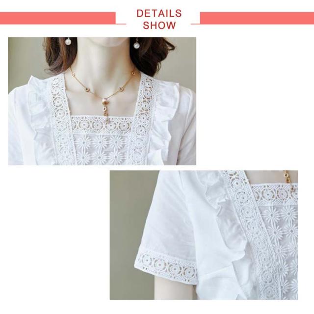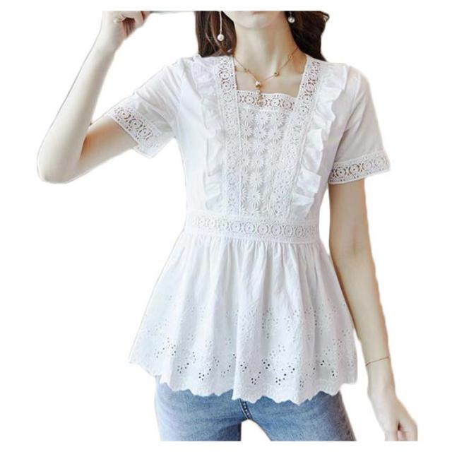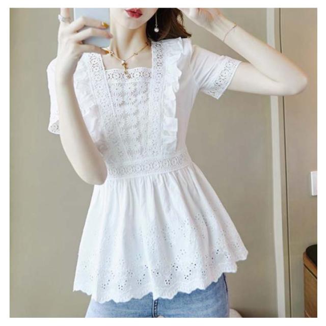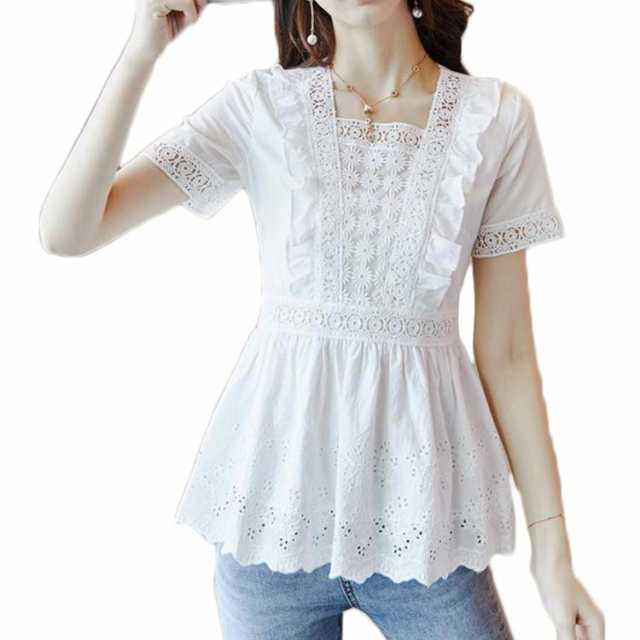 送料無料 ブラウス レディース レースシャツ 白 夏 半袖 刺繍 花柄 ホワイト チュニック 大人 オフィス トップス キレイめ 半袖ブラウス