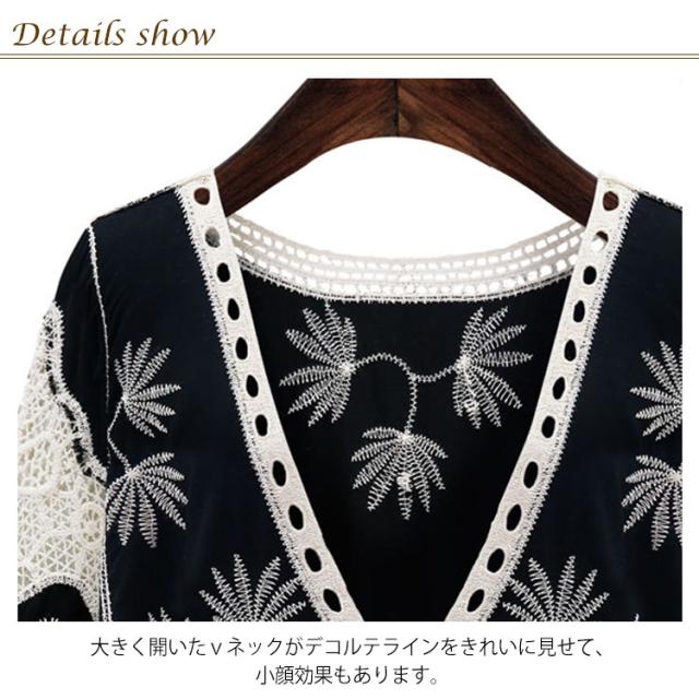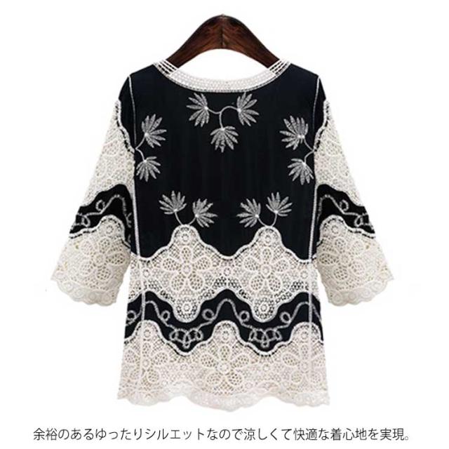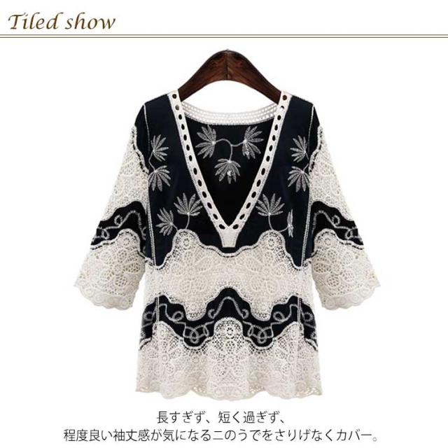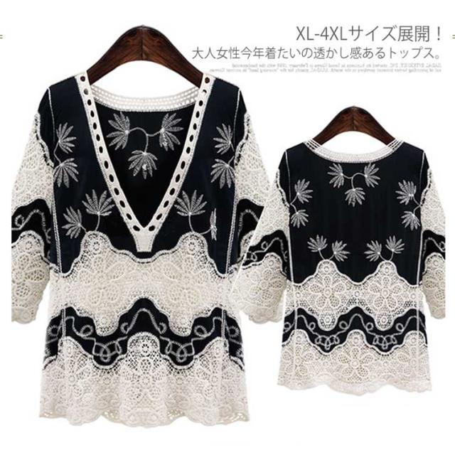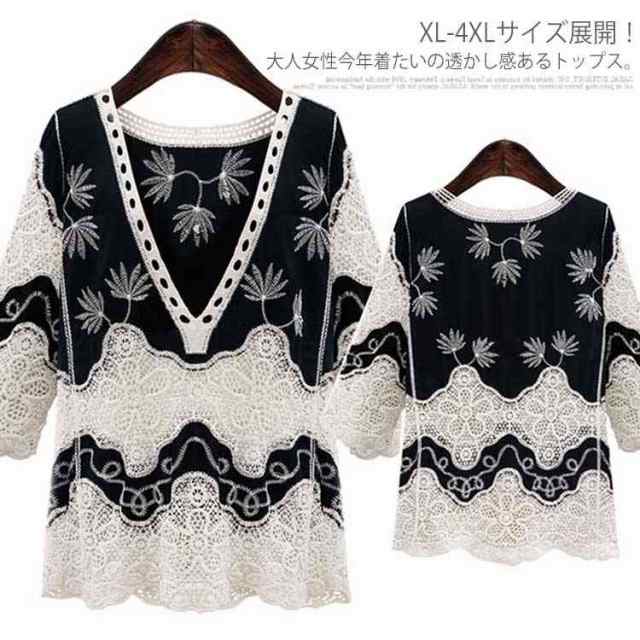 [大きサイズ LL-5L]春夏新作 vネック レーストップス vネックブラウス レディース シャツ ブラウス レース トップス tシャツ 刺繍入り 夏物 七分袖 透かし 透け感 キレイめ レディースファッション送料無料