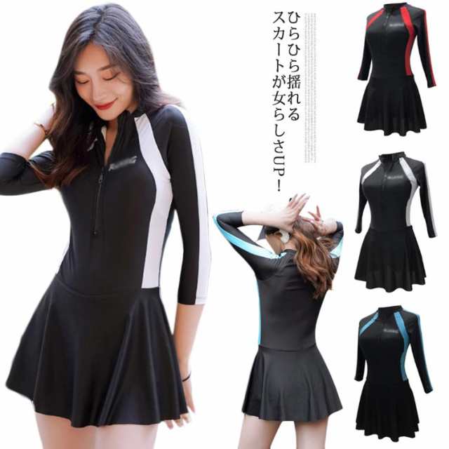 | ひらひら揺れるスカートが女らしさUP! 長めの袖丈で、紫外線から腕を守ります。 素材には伸縮性がある素材で動きやすい。 シンプルなワンピースタイプの水着でスリムに見せてくれる効果があります。 スカートの内にはパンツ付き、動きやすさを保ちながら露出をできるだけ少なくしたデザインです。 | |