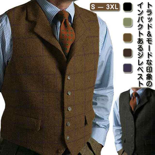 スリム 前開き メンズ ジレ チェック柄 細身 カジュアル ジレベスト 紳士 フォーマルベスト 襟付き スーツ ビジネス おしゃれ オフィス 通勤 ベスト 結婚式 二次会 成人式 イギリス風 春 秋
