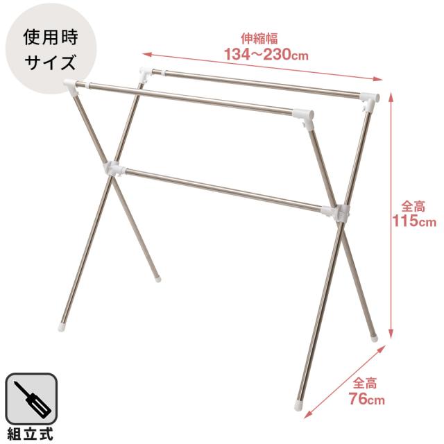 幅を伸縮できる全体幅は134〜230cmの範囲で伸縮可能。最大4枚のシングル布団が干せます。