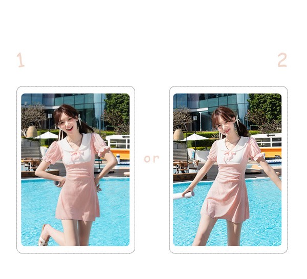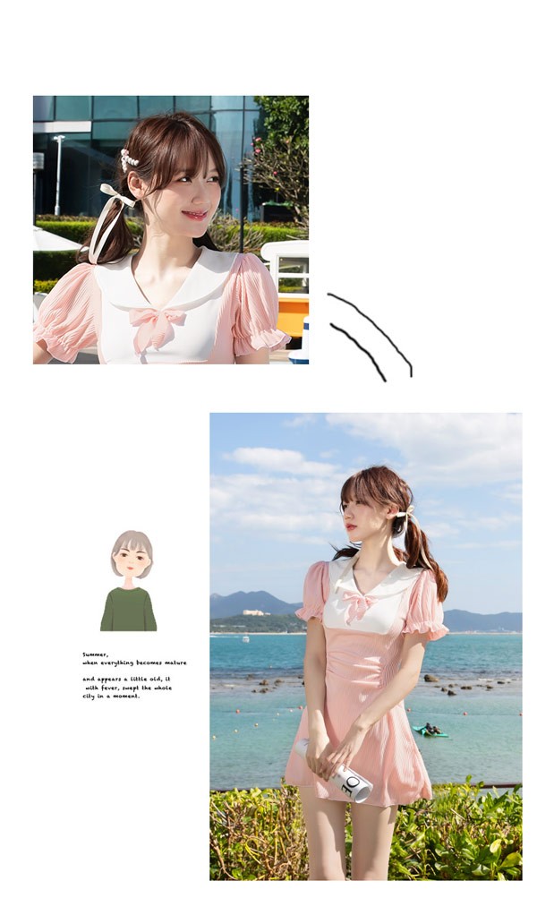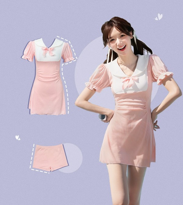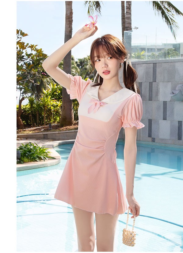 ワンピース水着 服みたいな 制服風 水着 レディース 半袖 リボン ワイヤーなし パッド付 着痩せ パフスリーブ シンプル セクシー 写真映え 撮影用 海 夏 サマー プール リゾート かわいい 旅行 温泉 大人 女性用 ジュニア 学生 女の子 ピンク M L XL 2XL mg893m4m4m5