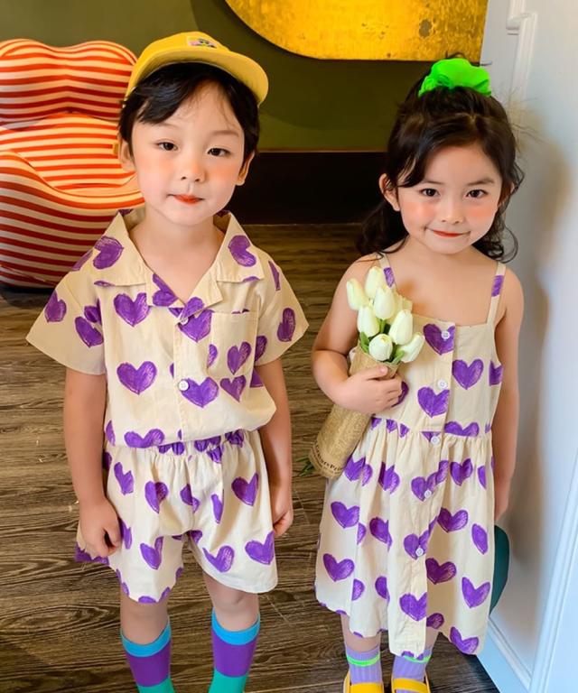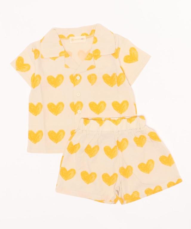子供らしい可愛いハートの総柄ブラウスとショートパンツの夏セットアップorワンピース。