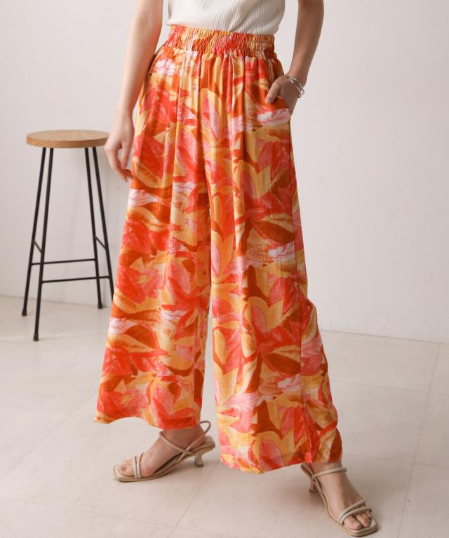 夏のムード高まる華やかカラーと、抽象的なリーフプリント柄が目を惹くワイドパンツ。無地のTシャツやタンクトップなどシンプルなトップスと合わせるだけで一気に垢抜ける万能アイテムです。ウエストは総ゴムで、サイドとヒップ部分にポケット付きなのもうれしいポイント。タウンユースやリゾートスタイルなど、幅広く着回ししていただけます。