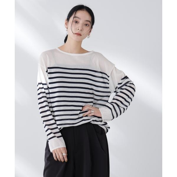 王道のボーダーを透け感ある素材で仕立てた薄手のニットトップス。やや長めの着丈と程よく余る幅感で、ゆるっと着て抜け感の出せるシルエットに。さらっとしたタッチで肌離れが良く、ロングシーズン着やすい軽い着心地も魅力のポイントです。