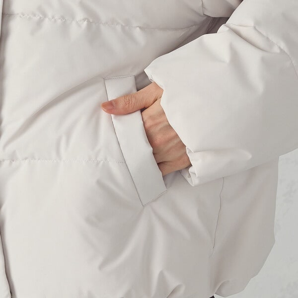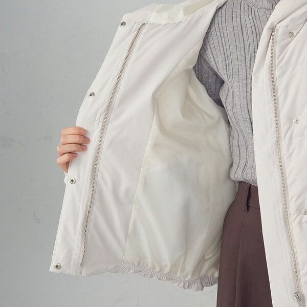 ■素材:ブラック/モカ/グレージュ:表地 ポリエステル100% 裏地ポリエステル100% 中わた 前立て・下前立て持ち出し・箱ポケット部分 ポリエステル100% 充填物 ダウン80% フェザー20%