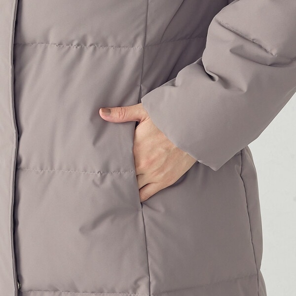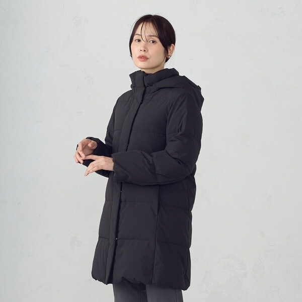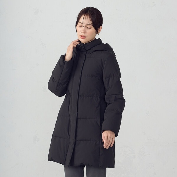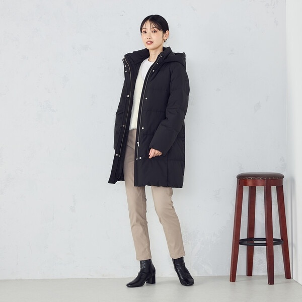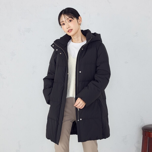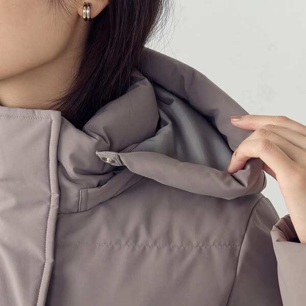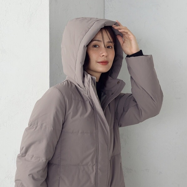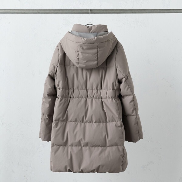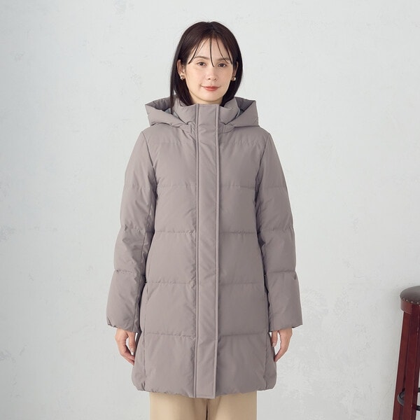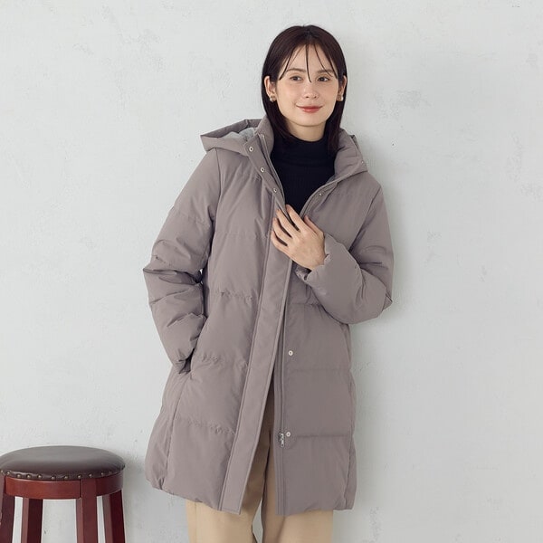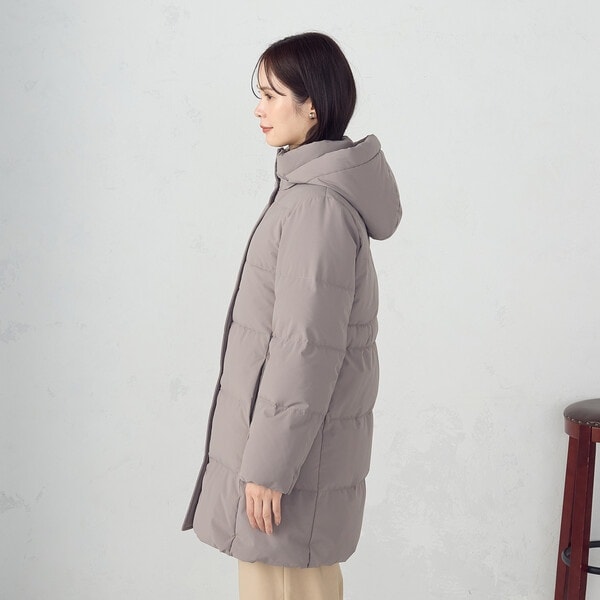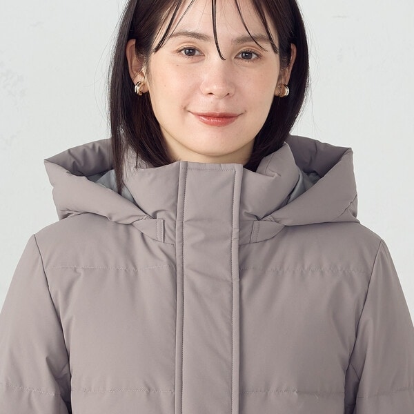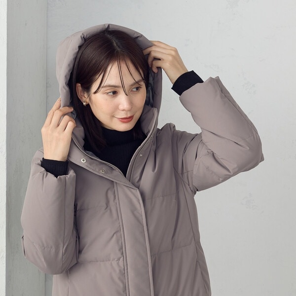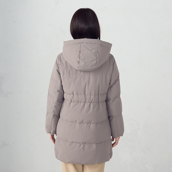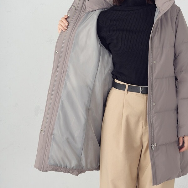 ■素材:ブラック/モカ/グレージュ:表地 ポリエステル100% 裏地ポリエステル100% 中わた 前立て・下前立て持ち出し・フード持ち出し・フード隠し布 ポリエステル100% 充填物 ダウン80% フェザー20%