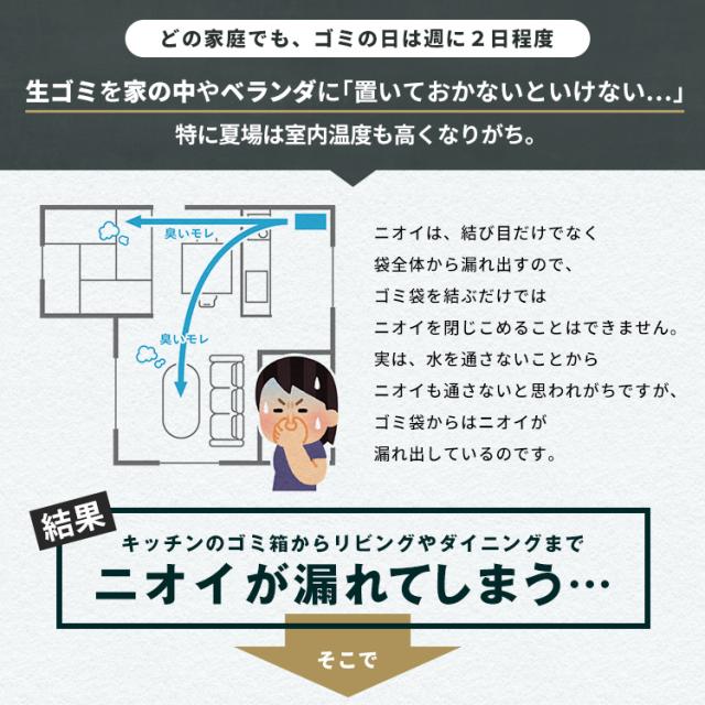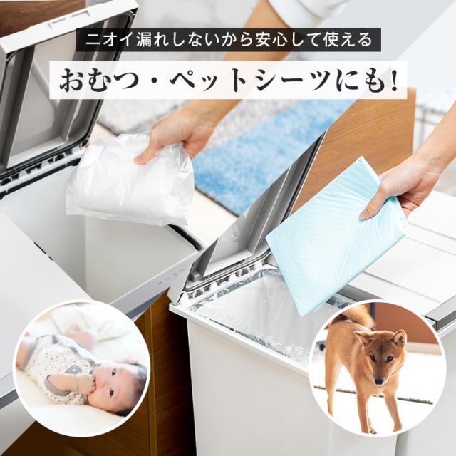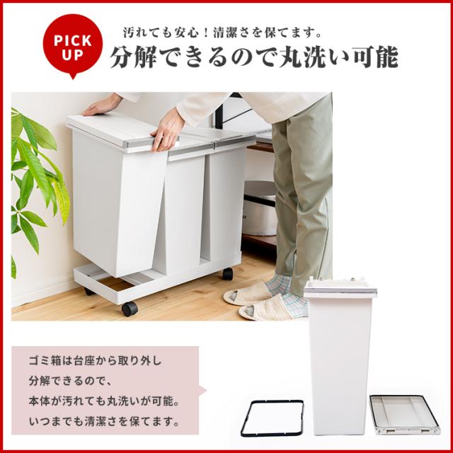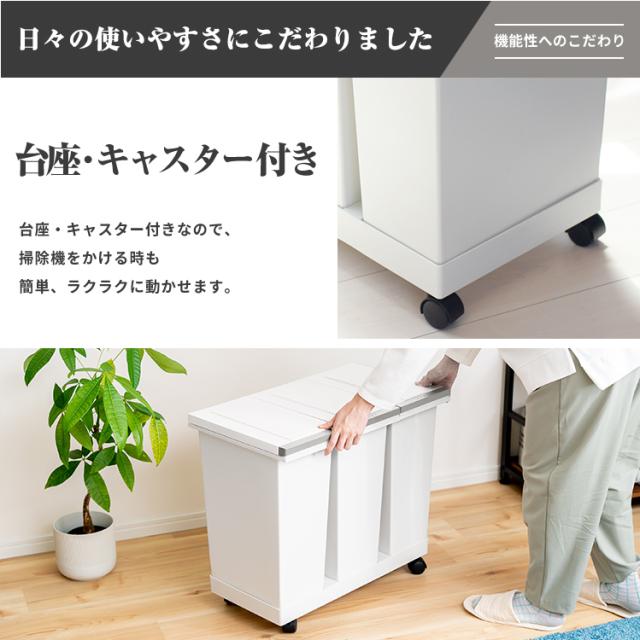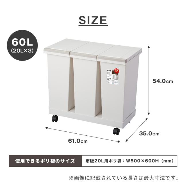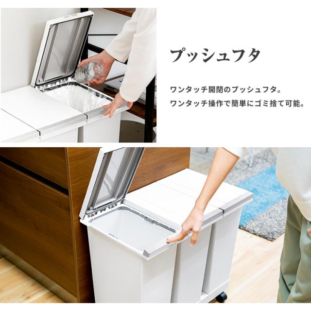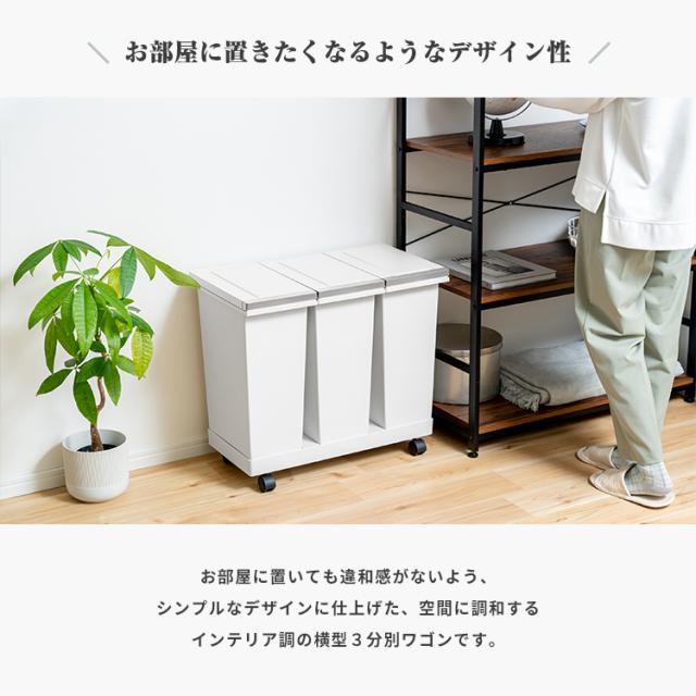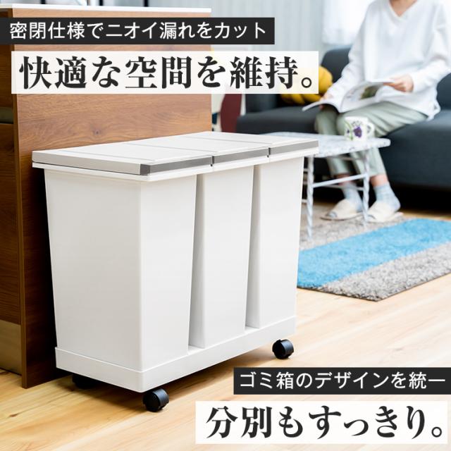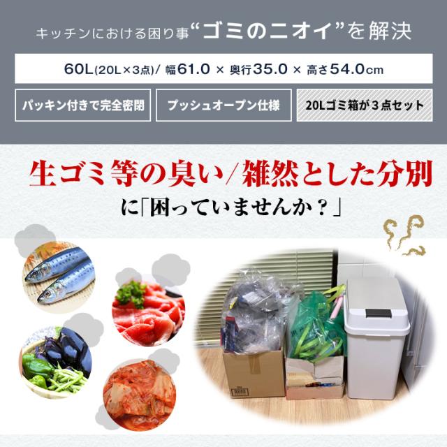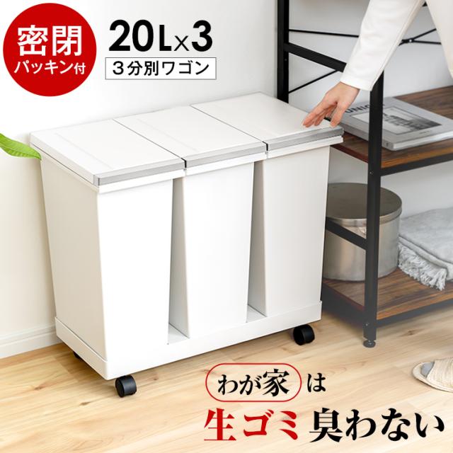 わが家は生ゴミ臭わない。密閉パッキン付きで臭いがもれない密閉プッシュペールシリーズに、おしゃれなモノトーンの「密閉プッシュ式資源ゴミ横型3分別ワゴン」。気になるキッチンの 生ごみのニオイ 分別 問題を解決。優れた密閉性で、赤ちゃんや介護のおむつ、犬猫用のペットシーツを捨てるのにも最適。片手で開閉できるワンプッシュオープン式のフタでゴミ捨てラクラク。20リットル のゴミ箱が3つ乗ったワゴンは、キャスター付で移動も楽。容量 : 60リットル ( 20リットル × 3個 )サイズ : 幅61.0×奥行35.0×高さ54.0cm材質 : フタ・本体・袋止め・台座=ポリプロピレン、プッシュレバー=ポリスチレン、バネユニット=ポリアセタール、バネ=ステンレス鋼、パッキン=シリコーンゴム、キャスター=ポリプロピレン/ナイロン日本製