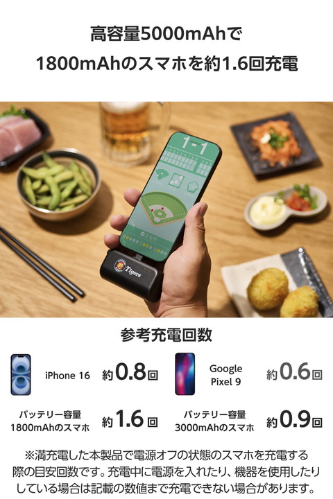 USB Type-C(TM)対応のスマートフォンに直接挿して充電できる阪神タイガースロゴ入りのモバイルバッテリーです。これ1つでサッと充電できるから、ケーブルをつなぐ必要はなし。手のひらに収まるコンパクトサイズで、小さなバッグの中でも場所を取らずに持ち歩けます。![]() ■AndroidやiPhone 15シリーズなどのスマートフォン・タブレットに直接挿して充電できるモバイルバッテリーです。充電中のケーブルの煩わしさを感じず、どこにいてもサッと充電できます。 ■手のひらに収まるコンパクトサイズ。バッグのポケットやショルダーポーチなどに収納して持ち運べます。 ■容量は5000mAh。iPhone 15を約0.9回、Google Pixel 7aを約0.7回充電できます。 ■約500回繰り返し使用可能なリチウムイオン電池を搭載。毎日使っても約1年半使用できます。 ■4段階のLEDランプでバッテリーの電池残量を一目で確認できます。 ■電池容量が160Wh(43,243mAh)以下であるため、機内持ち込みも可能です。旅行や出張時のかばんに手荷物として入れられます。 ■※航空会社の規定によって例外がある場合があります。 ■スマートフォンに挿した状態で本製品を充電することで、スマートフォン・本製品を両方充電できる「まとめて充電」に対応しています。カフェや旅先など、充電ポートが一つしかない場面でも便利です。 ■※スマートフォンへ優先的に充電されます。スマートフォンの充電が完了すると本製品に充電されます。 ■USB Type-C(TM)ポート搭載のAC充電器に本製品のコネクターを直接挿すことで、ケーブルを使わず本製品を充電できます。 ■阪神タイガースのヘルメットカラーをイメージし、通常製品のバリエーションにはない「ブラックカラー」を採用。また、容量が一目でわかるLEDランプのカラーには、阪神タイガースをイメージした黄色をセレクトしました。 ■本製品は阪神タイガースのオフィシャルライセンス製品です。熱い応援のお供としてもギフトとしてもおすすめです。 ■過充電・過放電・過電流防止機能・短絡保護機能・温度検知機能の5つの保護機能を備えた安心の回路設計に加え、PSEを取得。安全にご利用いただけます。 ■コネクターキャップは本体に付属しており、紛失の心配がありません。 ■端子周囲の厚みが4mm以下のスマホケースは、装着したまま直挿しが可能です。 ■本製品を充電できる、USB Type-C - USB Type-Cケーブルが付属しています。 ■※USB Type-C and USB-C are trademarks of USB Implementers Forum. ■環境に配慮した簡易パッケージを採用しています。 ■自社環境認定基準を1つ以上満たし、『THINK ECOLOGY』マークを表示した製品です。 ■環境保全に取り組み、製品の包装容器におけるプラスチック重量を、社内基準製品より20%以上削減した製品です。 ■環境保全に取り組み、製品の包装容器が紙・ダンボール・ポリ袋のみで構成されている製品です。 ![]() ■対応機種:Android、iPhone 15シリーズおよびUSB Type-C(TM)端子で充電するスマートフォン、タブレット他小型電子機器 ■コネクター形状(電源入力側):USB Type-Cプラグ×1、USB Type-Cポート×1 ■定格入力電圧:5V ■定格入力電流:2.4A ■コネクター形状(電源出力側):USB Type-Cプラグ×1 ■定格出力電圧:5V ■定格出力電流:3A ■電池種類:充電式リチウムイオン電池 ■電池定格容量:3.6V/5000mAh 18.0Wh ■充電時間:約2時間30分 ※12W以上のAC充電器を使用した場合 ■外形寸法:幅約79mm×奥行約27mm×高さ約51.5mm ■重量:約124g ■カラー:ブラック ■くり返し使用回数:500回 ■付属品:USB Type-C - USB Type-Cケーブル(0.1m) ■電気用品安全法:◯PSE 特定以外の電気用品 ■保証期間:1年間 |