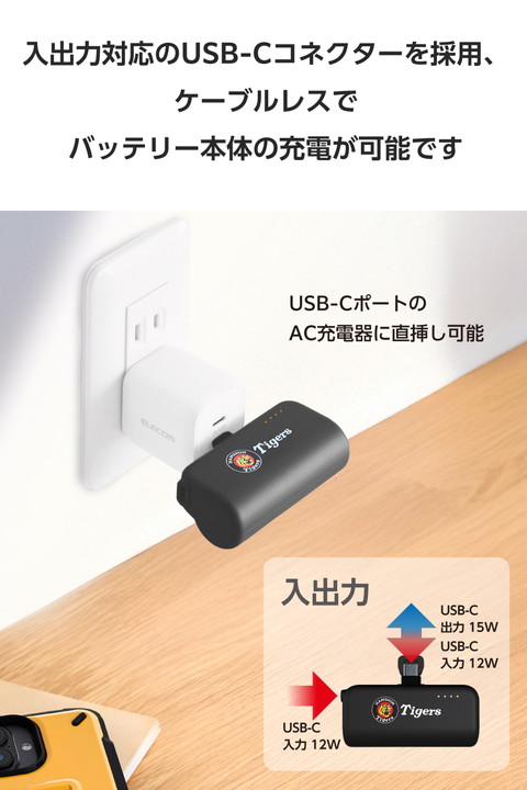 エレコム モバイルバッテリー 直挿し Type-C 入力/入出力 プラグ 5000mAh 15W リチウムイオン電池 阪神タイガース ┃DE-C43L-5000HBK