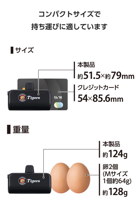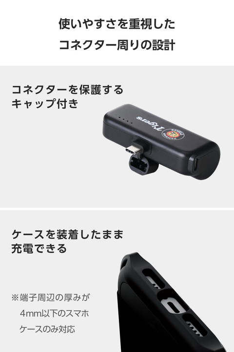 USB Type-C(TM)対応のスマートフォンに直接挿して充電できる阪神タイガースロゴ入りのモバイルバッテリーです。これ1つでサッと充電できるから、ケーブルをつなぐ必要はなし。手のひらに収まるコンパクトサイズで、小さなバッグの中でも場所を取らずに持ち歩けます。