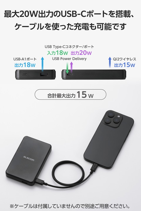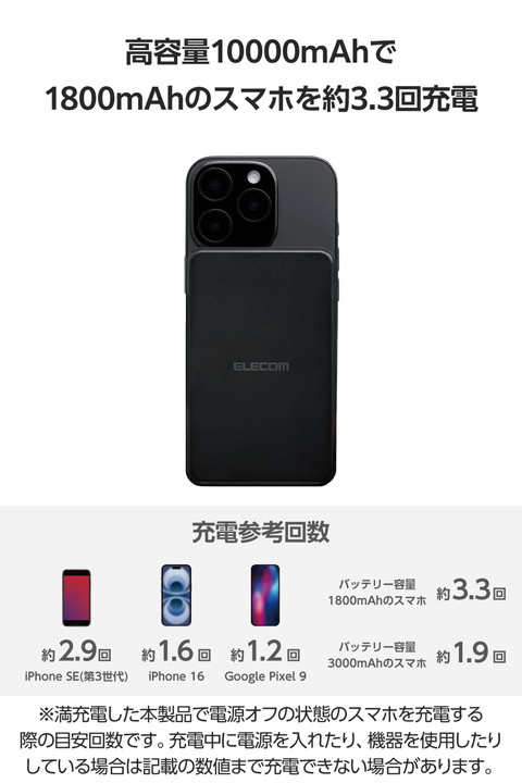ケーブルいらず!マグネットでピタッと簡単充電!Qi2対応iPhoneに取り付け、最大15Wのワイヤレス充電ができるモバイルバッテリーです。マグネットで背面にぴったりくっつくため、ワイヤレス充電中のスマホ操作も楽にできます。![]() ■Qi2対応iPhoneにマグネットで取り付け、最大15Wでワイヤレス充電できるモバイルバッテリーです。 ■WPC(ワイヤレスパワーコンソーシアム)が策定したワイヤレス給電の国際標準規格「Qi(チー)2」に準拠した正規認証品です。 ■エレコムはWPCの会員企業です。 ■強力なマグネットでスマートフォンをしっかり吸着。コイル位置がぴったり合い効率よく充電できます。 ■※iPhone 12以降のMagSafe対応iPhoneおよび、Qi2規格のマグネット固定に対応した機器のみに対応しています。 ■※ケースを外した状態、またはワイヤレス充電とマグネット固定に対応したケースを装着した状態でご利用ください。 ■本製品は、電磁誘導技術を活用したワイヤレス充電の規格である「Qi(チー)2」に準拠しており、同規格に準拠した機器と互換性があります。 ■※機器によってはうまく動作しない場合があります。本製品および、ご使用になる機器の取扱説明書をよくお読みください。 ■最大出力20WのUSB Type-C(TM)ポート×1、最大出力18WのUSB-Aポート×1を搭載。Qi2ワイヤレス充電の他に、ケーブルを使った充電も可能です。 ■※USB Type-CとUSB-Aの同時接続の場合、合計最大出力15Wとなります。 ■USB Type-C+Qi2ワイヤレス、またはUSB-A+Qi2ワイヤレスで充電した場合、Qi2ワイヤレス出力が停止し、単ポート時の最大出力(USB Type-C:20W、USB-A:18W)になります。 ■USB Type-CポートまたはUSB-Aポートによる有線充電とワイヤレス充電を同時に使用した場合、有線充電が優先され、ワイヤレス充電は停止します。 ■Bluetooth(R)イヤホンなどが充電可能な低電流モードに対応しています。 ■※USB-Aポートのみ対応しています。 ■接続機器を見分けて、最適に充電を行う”おまかせ充電”に対応しています。 ■※USB-Aポートのみ対応しています。 ■本製品(バッテリー容量10000mAh)で、1800mAhのスマートフォンを約3.3回、3000mAhのスマートフォンを約1.9回充電可能です。 ■※満充電した本製品のUSB Type-Cポートから充電した場合の目安です。 ■※満充電した本製品で電源オフの状態のスマートフォンを充電する際の目安回数です。充電中に電源を入れたり、機器を使用したりしている場合は記載の数値まで充電できない場合があります。 ■※ワイヤレス出力を使用した場合の充電回数は記載の数値より低くなります。 ■NINTENDO SWITCH(TM)、NINTENDO SWITCH Lite(TM)などのゲーム機も充電可能です。 ■※NINTENDO SWITCHドックでの充電はできません。 ■本製品とスマートフォンを同時に接続することでまとめて充電できる“まとめて充電”に対応しています。 ■※スマートフォンへ優先的に充電されます。スマートフォンの充電が完了すると本製品に充電されます。 ■※接続機器によっては本製品への充電が優先され、機器への充電に時間がかかる場合があります。 ■本製品は約4時間で充電できます。 ■※USB Power Delivery 20W以上のAC充電器にUSB Type-C - USB Type-Cケーブルを接続し充電した場合の目安です。スマートフォンなどのモバイル機器を接続した場合は記載の時間では充電できません。 ■Thermal Protection機能を搭載し、24時間温度を監視、制御することでお使いの機器を守ります。 ■過充電・過放電・過電流防止機能および短絡保護機能と異物検知機能の5つの保護機能を備えた安心の回路設計です。 ■電池容量が160Wh(43,243mAh)以下であるため、機内持ち込みも可能です。 ■※航空会社の規定によって例外がある場合があります。 ■※詳しい条件は各航空会社の機内持ち込みに関するページをご参照ください。 ■内蔵の充電式リチウムイオン電池は、JIS C8711およびJIS C8712(JIS C8714の内容を含む)に準拠した安全設計です。 ■日本の電気用品安全法(PSE)の技術基準に適合した安全性の高い製品です。 ■※本製品にケーブルは付属していません。別途ご用意ください。 ■※ケーブルを挿したままにするとバッテリーの残量が減ってしまいます。使用しない場合は必ずケーブルを外してください。 ■※AC充電器は同梱しておりません。別途ご購入またはご用意ください。 ■※AC充電器はUSB Type-Cの出力ポートを持つ20W以上のものを推奨します。20W未満のAC充電器で充電した場合や、USB Type-C - USB-Aケーブルで充電した場合、記載の時間では満充電にならない場合があります。 ■本製品は磁石を使用しています。磁気カード(クレジットカード・キャッシュカードなど)を近づけないでください。 ■※工場出荷時に70%程度充電されています。充電式リチウムイオン電池は時間とともに放電するので、ご使用になる前に充電することを推奨します。 ■※充電対応機種はエレコムホームページの対応表をご確認ください。 ■※USB Type-C and USB-C are trademarks of USB Implementers Forum. ■本製品は、一般社団法人JBRCの回