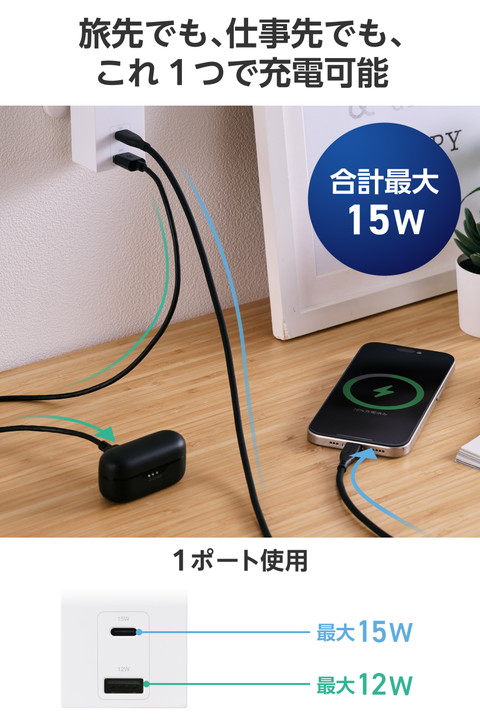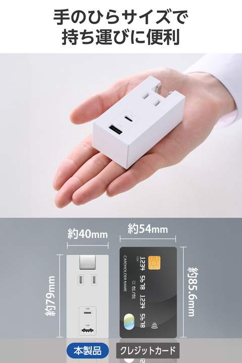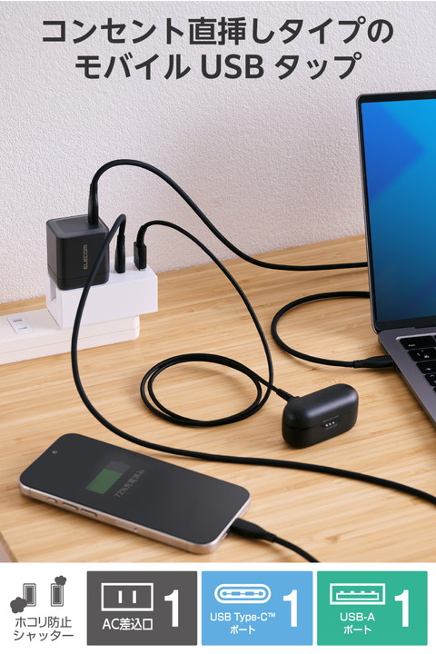 ACアダプター不要。スマートフォンやワイヤレスイヤホンなどの充電を、これ1台で。AC差込口、USB-Aポート、USB Type-C(TM)ポート各1つずつが一体になったモバイルUSBタップです。コンパクトサイズで出張や旅行などの持ち運びに便利です。