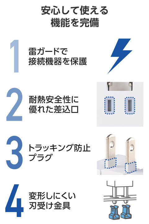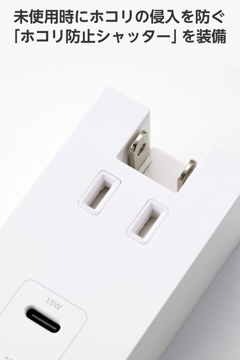 ACアダプター不要。スマートフォンやワイヤレスイヤホンなどの充電を、これ1台で。AC差込口、USB-Aポート、USB Type-C(TM)ポート各1つずつが一体になったモバイルUSBタップです。コンパクトサイズで出張や旅行などの持ち運びに便利です。![]() ■ACタップとUSBポートが一体になった、スマートフォンやワイヤレスイヤホンなどを同時に充電できるコンセント直挿しタイプのモバイルUSBタップです。ACアダプターなどを別途用意することなく、本製品1つで充電できます。 ■USB-Aポート×1、USB Type-C(TM)ポート×1を搭載。USB Type-Cポートからは最大15Wでの充電が可能です。 ■コンパクトな手のひらサイズで、出張や旅行などの持ち運びに便利です。 ■差込口には、未使用時にホコリの侵入を防止する「ホコリ防止シャッター」を装備しています。 ■USB-Aポートには接続機器を自動で見分け、適した出力で充電する「おまかせ充電」機能を搭載しています。 ■筐体には高い難燃性を備えたPC樹脂、AC差込口周りには熱硬化性樹脂(ユリア樹脂)を用いた二重構造で、万が一の発熱の際に融解しにくく、電気火災の防止に有効です。 ■サージ電流耐量2750A/5回、2500A/10回、制限電圧775Vmax(25A 8/20μs)の素子(バリスタ)を搭載しており、誘導雷による雷サージを吸収して接続機器を保護します。 ■※直撃雷や、誘導雷であっても素子の許容値を超える雷サージが発生した場合、接続機器を保護できない場合があります。また、受けた電圧や回数により性能は劣化します。 ■刃受け金具には繰り返しの使用でも変形しにくい0.8mm厚を採用しています。プラグの保持力が低下しにくく、発熱を抑制します。 ■プラグには栓刃間に火災の原因となる、トラッキング現象防止に有効な熱硬化性樹脂を配し、感電の危険を抑制する絶縁スリーブを装備しています。 ■2ピン式の電源プラグは、シーンに合わせて設置しやすい180°スイングプラグを採用しており、未使用時は電源プラグを折りたたんで本体に収納可能です。 ■※充電に必要な各種ケーブルは同梱しておりません。別途お買い求めの上、ご使用下さい。 ■※電源プラグを間違ってUSBポートに差し込まないよう十分ご注意ください。ポートの変形や短絡により発熱や発火の原因になる可能性があります。 ■※USB Type-C and USB-C are trademarks of USB Implementers Forum. ■自社環境認定基準を1つ以上満たし、『THINK ECOLOGY』マークを表示した製品です。 ■環境保全に取り組み、製品の包装容器におけるプラスチック重量を、社内基準製品より20%以上削減した製品です。 ■環境保全に取り組み、製品の包装容器が紙・ダンボール・ポリ袋のみで構成されている製品です。 ![]() ■差込口仕様:Aタイプ 2ピン ■差込口個数:1個口 ■プラグ仕様:Aタイプ 2ピン ■USB端子形状:USB Type-C(TM)ポート×1、USB-Aポート×1 ■AC側定格:14A 125V 1400Wまで ■USB側定格入力:AC100V-125V 50/60Hz 0.6A ■USB側定格出力(1ポート使用時):USB Type-Cポート:15W(5V/3A)、USB-Aポート:12W(5V/2.4A) ■USB側定格出力(2ポート使用時):USB Type-Cポート+USB-Aポート:合計15W(5V/3A)(USB Type-C 15W(5V/3A)、USB-A 12W(5V/2.4A)) ■極性対応:× ■スイッチ:× ■雷ガード:○ ■ホコリシャッター:○(AC差込口のみ) ■抜け止め機能:× ■通電表示ランプ:× ■二重構造:○ ■絶縁キャップ付きプラグ:○ ■スイングプラグ:○(180度展開) ■ブレーカー:× ■ノイズフィルター:× ■モジュラージャック:× ■連動機能:× ■変換アダプター:× ■カラー:ホワイト ■材質:ポリカーボネート樹脂、ユリア樹脂、黄銅 ■外形寸法:幅約40mm×奥行約31mm×高さ約79mm ※突起部を除く ■質量:約99g ■付属品:取扱説明書 ■環境配慮事項:THINK ECOLOGY対応製品 ■使用可能地域:日本国内専用 ■法規:◇PSE 特定電気用品 ■保証期間:1年間 |