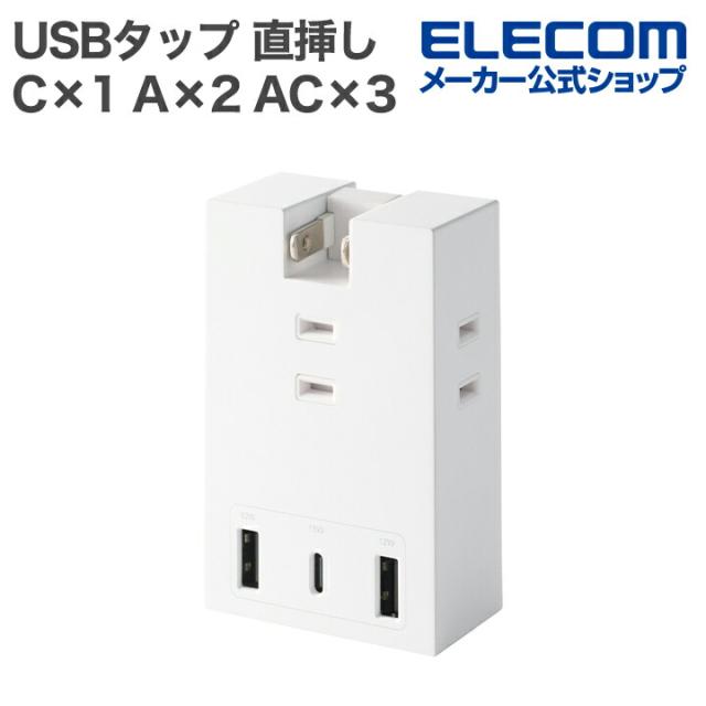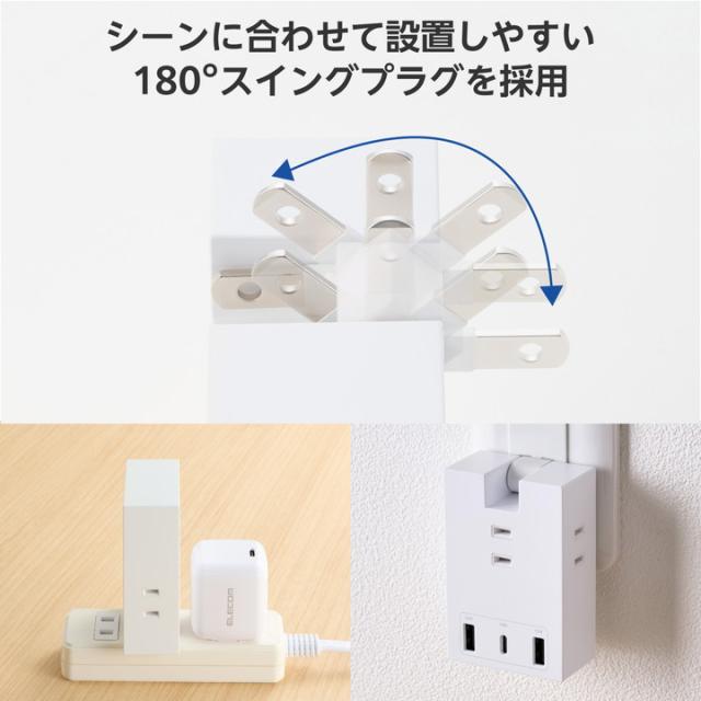 エレコム USBタップ コンセント直挿し Type-C×1 USB-A×2 AC×3 15W 直挿し 180度スイング Support Ber ホワイト┃T-U07-3A2CWH