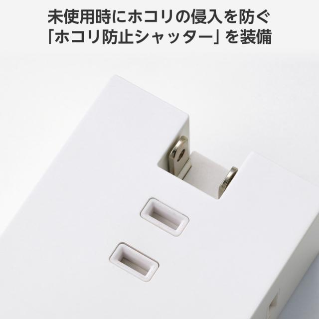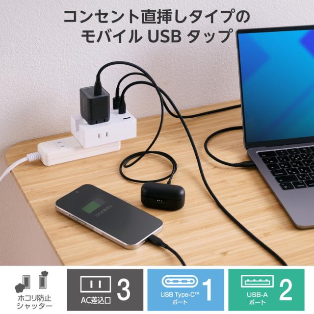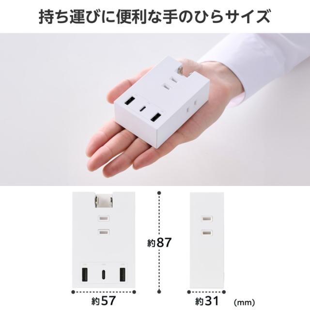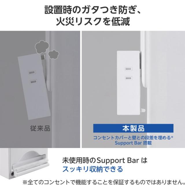 ACアダプター不要。スマートフォンやワイヤレスイヤホンなどの充電を、これ1台で。3つのAC差込口、2つのUSB-Aポート、1つのUSB Type-C(TM)ポートが一体になったモバイルUSBタップです。最大6台のデバイスを接続でき、コンセントの少ない場所で活躍します。設置時にコンセントカバーと壁との段差でガタつき、プラグが抜けそうになるのを防ぐ「Support Bar」を搭載しています。