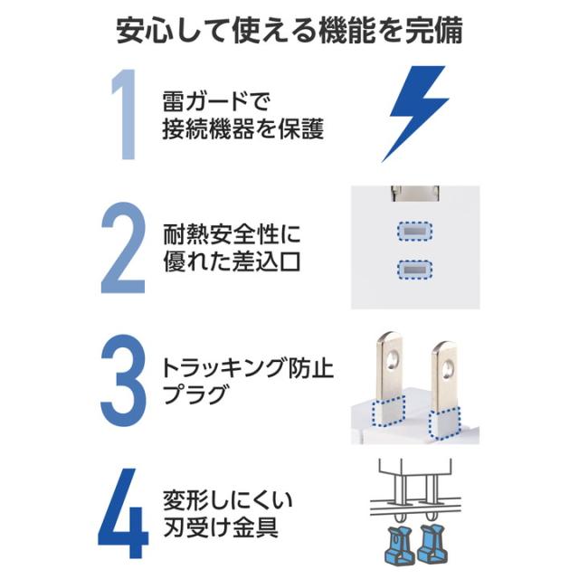 ACアダプター不要。スマートフォンやワイヤレスイヤホンなどの充電を、これ1台で。3つのAC差込口、2つのUSB-Aポート、1つのUSB Type-C(TM)ポートが一体になったモバイルUSBタップです。最大6台のデバイスを接続でき、コンセントの少ない場所で活躍します。設置時にコンセントカバーと壁との段差でガタつき、プラグが抜けそうになるのを防ぐ「Support Bar」を搭載しています。![]() ■ACタップとUSBポートが一体になった、スマートフォンやワイヤレスイヤホンなどを充電できるコンセント直挿しタイプのモバイルUSBタップです。ACアダプターなどを別途用意することなく、本製品1つで充電できます。 ■USB-Aポート×2、USB Type-C(TM)ポート×1を搭載。USB Type-Cポートからは最大15Wでの充電が可能です。 ■コンパクトな手のひらサイズで、出張や旅行などの持ち運びに便利です。 ■差込口には、未使用時にホコリの侵入を防止する「ホコリ防止シャッター」を装備しています。 ■設置時にコンセントカバーと壁との段差でガタつき、プラグが抜けそうになるのを防ぐ「Support Bar」を搭載。段差を埋めることでプラグの根元にホコリが溜まりにくくなり、火災のリスクを低減します。可動式のため、未使用時はスッキリ収納できます。 ■※全てのコンセントで機能することを保証するものではありません。 ■USB-Aポートには接続機器を自動で見分け、適した出力で充電する「おまかせ充電」機能を搭載しています。 ■筐体には高い難燃性を備えたPC樹脂、AC差込口周りには熱硬化性樹脂(ユリア樹脂)を用いた二重構造で、万が一の発熱の際に融解しにくく、電気火災の防止に有効です。 ■サージ電流耐量2750A/5回、2500A/10回、制限電圧775Vmax(25A 8/20μs)の素子(バリスタ)を搭載しており、誘導雷による雷サージを吸収して接続機器を保護します。 ■※直撃雷や、誘導雷であっても素子の許容値を超える雷サージが発生した場合、接続機器を保護できない場合があります。また、受けた電圧や回数により性能は劣化します。 ■刃受け金具には繰り返しの使用でも変形しにくい0.8mm厚を採用しています。プラグの保持力が低下しにくく、発熱を抑制します。 ■プラグには栓刃間に火災の原因となる、トラッキング現象防止に有効な熱硬化性樹脂を配し、感電の危険を抑制する絶縁スリーブを装備しています。 ■2ピン式の電源プラグは、シーンに合わせて設置しやすい180°スイングプラグを採用しており、未使用時は電源プラグを折りたたんで本体に収納可能です。 ■※USBを使用する際に必要な各種ケーブルは同梱しておりません。別途ご用意ください。 ■※電源プラグを間違ってUSBポートに差し込まないよう十分ご注意ください。ポートの変形や短絡により発熱や発火の原因になる可能性があります。 ■※USB Type-C and USB-C are trademarks of USB Implementers Forum. ■自社環境認定基準を1つ以上満たし、『THINK ECOLOGY』マークを表示した製品です。 ■環境保全に取り組み、製品の包装容器におけるプラスチック重量を、社内基準製品より20%以上削減した製品です。 ■環境保全に取り組み、製品の包装容器が紙・ダンボール・ポリ袋のみで構成されている製品です。 ![]() ■差込口仕様:Aタイプ 2ピン ■差込口個数:3個口 ■プラグ仕様:Aタイプ 2ピン ■USB端子形状:USB Type-C(TM)ポート×1、USB-Aポート×2 ■AC側定格:14A 125V 1400Wまで ■USB側定格入力:AC100V-125V 50/60Hz 0.6A ■USB側定格出力(1ポート使用時):USB Type-Cポート:15W(5V/3A)、USB-Aポート:12W(5V/2.4A) ■USB側定格出力(2ポート使用時):USB Type-Cポート+USB-Aポート:合計15W(5V/3A)(USB Type-C 15W(5V/3A)、USB-A 12W(5V/2.4A))、USB-Aポート+USB-Aポート:合計15W(5V/3A)(各USB-A 12W(5V/2.4A)) ■USB側定格出力(3ポート使用時):USB Type-Cポート+USB-Aポート+USB-Aポート:合計15W(5V/3A)(USB Type-C 15W(5V/3A)、各USB-A 12W(5V/2.4A)) ■極性対応:× ■スイッチ:× ■雷ガード:○ ■ホコリシャッター:○(AC差込口のみ) ■抜け止め機能:× ■通電表示ランプ:× ■二重構造:○ ■絶縁キャップ付きプラグ:○ ■スイングプラグ:○(180度展開) ■ブレーカー:× ■ノイズフィルター:× ■モジュラージャック:× ■連動機能:× ■変換アダプター:× ■カラー:ホワイト ■材質:ポリカーボネート樹脂、ユリア樹脂、黄銅 ■外形寸法:幅約57mm×奥行約31mm×高さ約87mm ※突起部を除く ■質量:約153g ■付属品:取扱説明書 ■環境配慮事項:THINK ECOLOGY対応製品 ■使用可能地域:日本国内専用 ■法規:◇PSE 特定電気用品 ■保証期間:1年間 ■その他:設置時のガタつきを抑えるSupport Barを装備 ※全てのコンセントで機能することを保証するものではありません。 |
