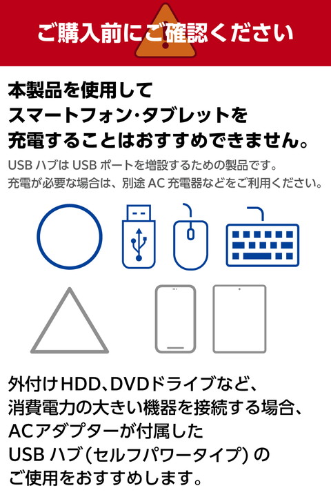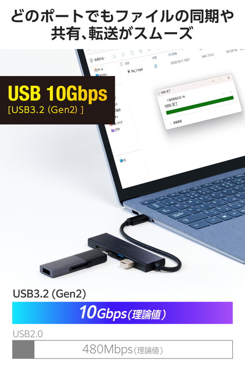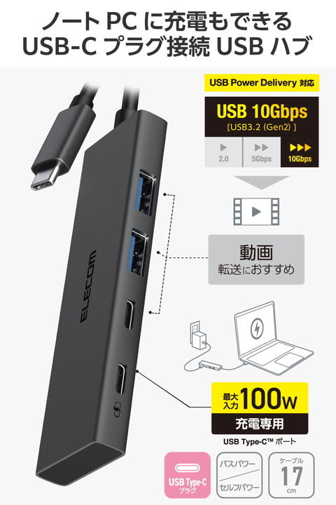 USB-Aポートを増やしてデスクまわりをすっきり。データ専用の2つのUSB-Aポートと1つのUSB Type-C(TM)ポート、給電専用のUSB Power Delivery対応USB Type-Cポートも搭載した、USB Type-C接続のUSBハブです。USB 10Gbps(USB3.2(Gen2))で高速データ転送が可能です。![]() ■USB-A・USB Type-C(TM)ポートを搭載したUSB Type-Cプラグ接続USBハブです。ポートの少ないパソコンでも多様な周辺機器を接続できます。 ■USB-Aポート×2、USB Type-Cポート×1を搭載。マウスやキーボード、USBメモリなどをこの1台にまとめて接続できます。 ■給電専用USB Type-Cポート×1も搭載。USB Power Deliveryに対応し、最大入力100Wでパソコンへの給電が可能。 ■※製品本体にて15Wを消費するため、最大入力100W/最大出力85Wとなります。 ■※85Wで給電する場合は、100W出力のAC充電器をご用意ください。 ■すべてのポートをフロントに集めて配置。同じ方向から接続できるため、デスクまわりの幅を取らずすっきり配線できます。 ■データ転送ポートは全て、最大10Gbps(理論値)の高速データ転送が可能。どのポートに接続してもファイルの同期や共有、転送がスムーズです。動画などのデータ転送におすすめです。 ■安定した電源供給が可能なセルフパワー・バスパワー共用タイプです。 ■機能を絞った厚さ約10mmの薄型設計で、在宅ワークや出張、旅行の持ち運びにも便利です。 ■ケーブルは紛失の心配がない直付けタイプで、ケーブル長は取り回しのしやすい約0.17mです。 ■放熱性と耐ノイズ性に優れ、高級感のあるアルミ筺体を使用しています。 ■※USB Type-C and USB-C are trademarks of USB Implementers Forum. ■自社環境認定基準を1つ以上満たし、『THINK ECOLOGY』マークを表示した製品です。 ■廃棄物削減に取り組み、製品に同梱する取扱説明書等をペーパーレス化した製品です。 ■環境保全に取り組み、製品の包装容器におけるプラスチック重量を、社内基準製品より20%以上削減した製品です。 ■環境保全に取り組み、製品の包装容器が紙・ダンボール・ポリ袋のみで構成されている製品です。 ![]() ■コネクター仕様(アップストリーム):USB Type-C(TM)プラグ×1<USB 10Gbps(USB3.2(Gen2))/USB2.0/USB1.1> ■USBポート(ダウンストリーム):USB-Aポート×2<USB 10Gbps(USB3.2(Gen2))>、USB Type-Cポート×1<USB 10Gbps(USB3.2(Gen2))>、USB Type-Cポート×1<給電専用USB PowerDelivery対応(最大入力100W/最大出力85W)> ■対応OS(Windows):Windows 11/10 ■対応OS(macOS):macOS Sequoia 15 ■対応OS(iPadOS):iPadOS 18 ■対応OS 備考:※各OSの最新バージョンへのアップデートや、サービスパックのインストールが必要になる場合があります。 ■ケーブル長:約0.17m ※コネクター含まず ■電源方式:バスパワー/セルフパワー共用 ■動作環境:温度0℃〜45℃、湿度10%〜85%(結露なきこと) ■VCCI:Class B対応 ■カラー:ブラック ■外形寸法:幅約97mm×奥行約29mm×高さ約10mm ※ケーブル含まず ■重量:約43g ■保証期間:1年間 |