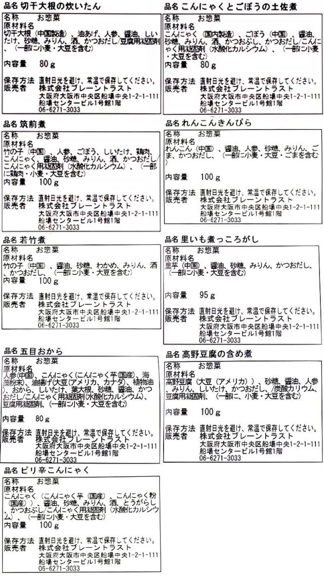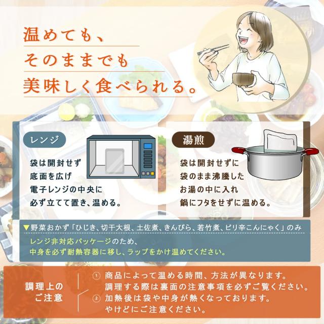 下記商品を追加して選べる種類を29種にリニューアルしました。 ■ ええおかず 牛すき焼き風煮140g だし香る魚つみれ煮110g 鶏の南蛮漬け155g さばのトマト煮90g トマトクリームチキン145g だし染み鶏大根150g ぶり大根120g 若竹煮100g 里いも煮っころがし95g 五目おから80g れんこんきんぴら100g 高野豆腐の含め煮100g ピリ辛こんにゃく100g |