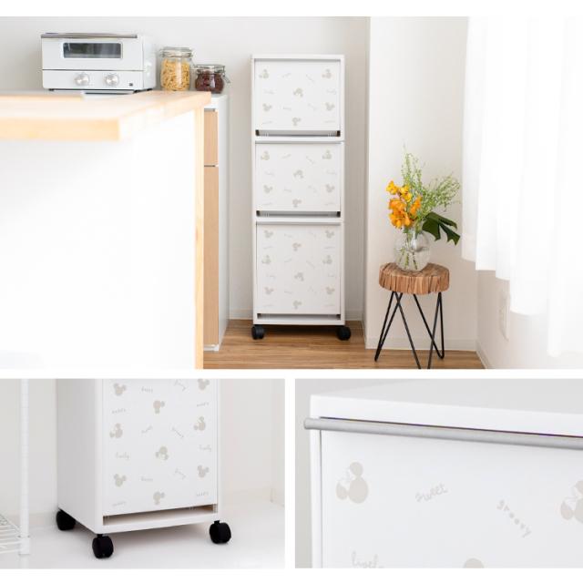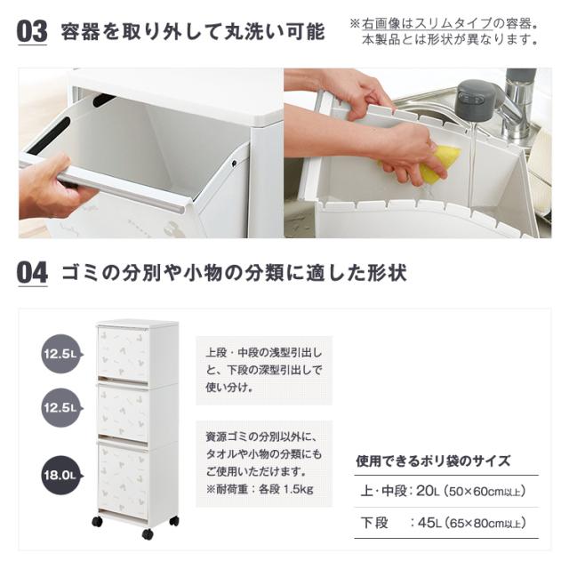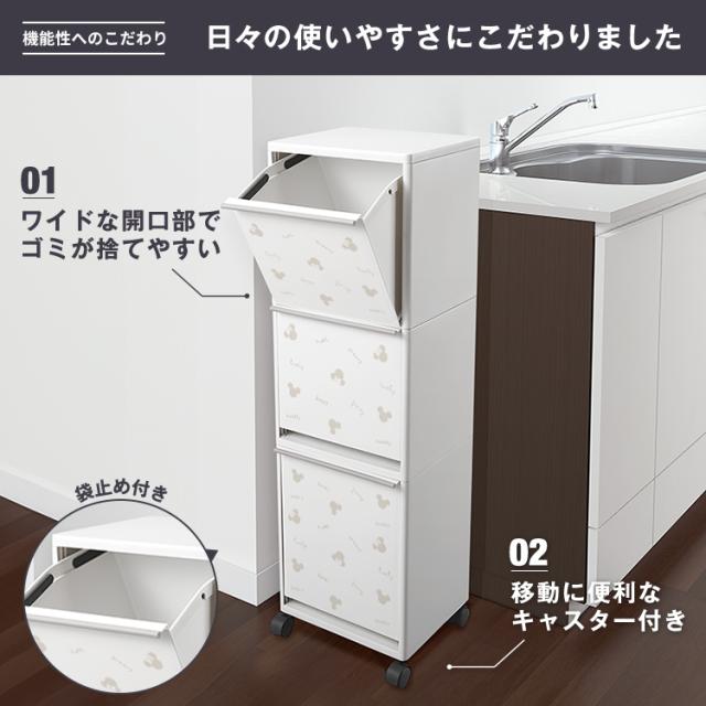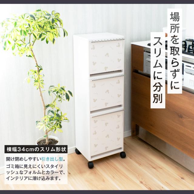 大人気の3段ゴミ箱にディズニーデザインが仲間入り♪アルミ缶やペットボトル、食品トレー、ガラスなどの資源ゴミの分別に最適な分別ワゴンゴミ箱。キャスター付きだから、掃除などの際の移動に便利。容量 : 43.0リットル (上段・中段 12.5リットル 下段 18リットル )サイズ : 幅33.5×奥行27.5×高さ99.0cm(キャスター含む)材質 : 本体・引出し・ポリ袋止め・天板=ポリプロピレン キャスター=PP/PA日本製