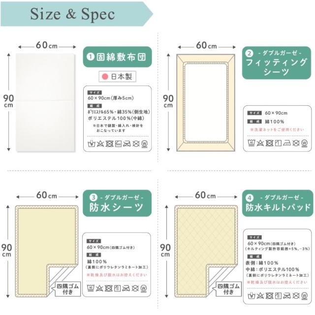 日本製固綿敷布団とお肌にやさしいWガーゼ防水アイテム(フィッティングシーツ/防水シーツ/防水キルトパッド)がセットになりました。