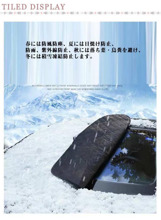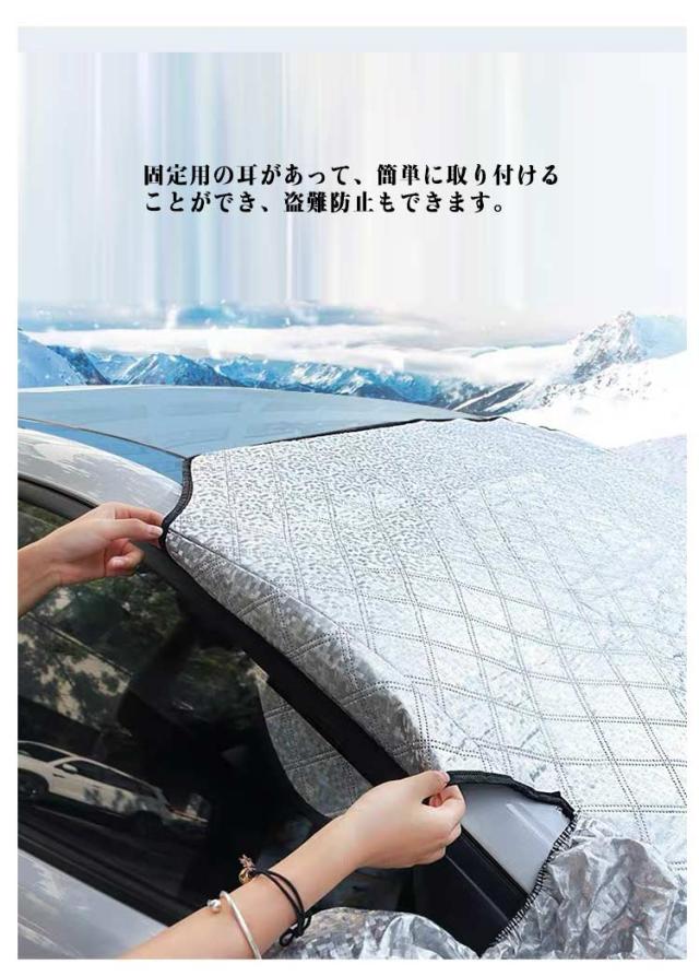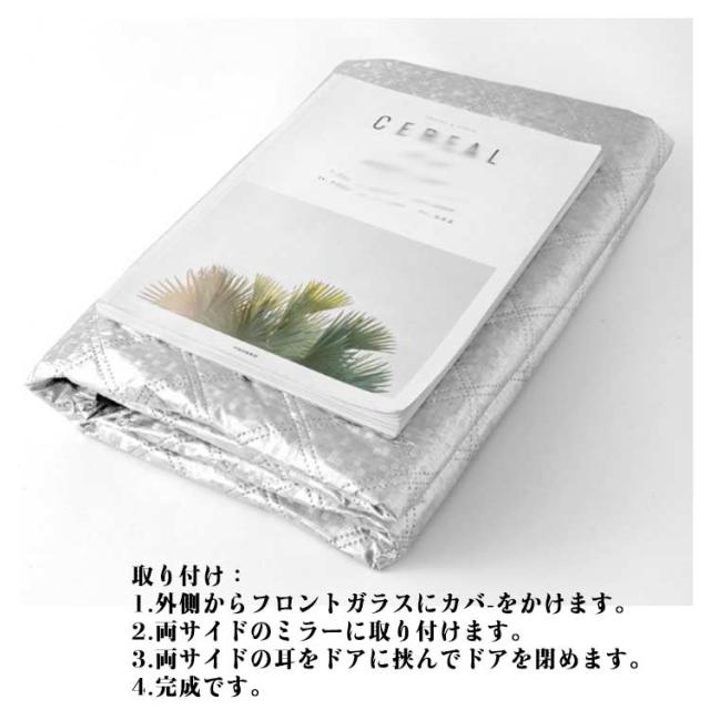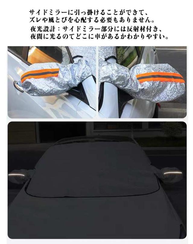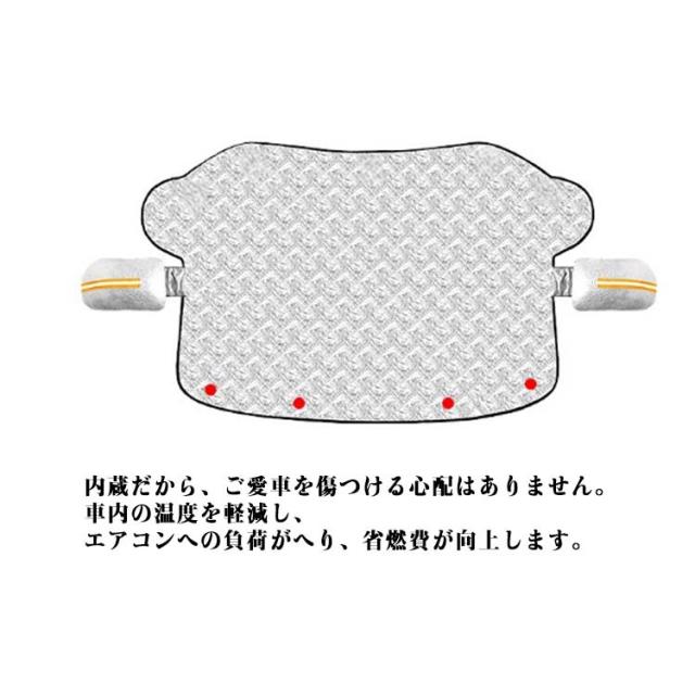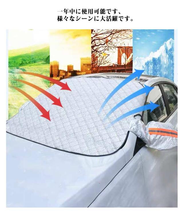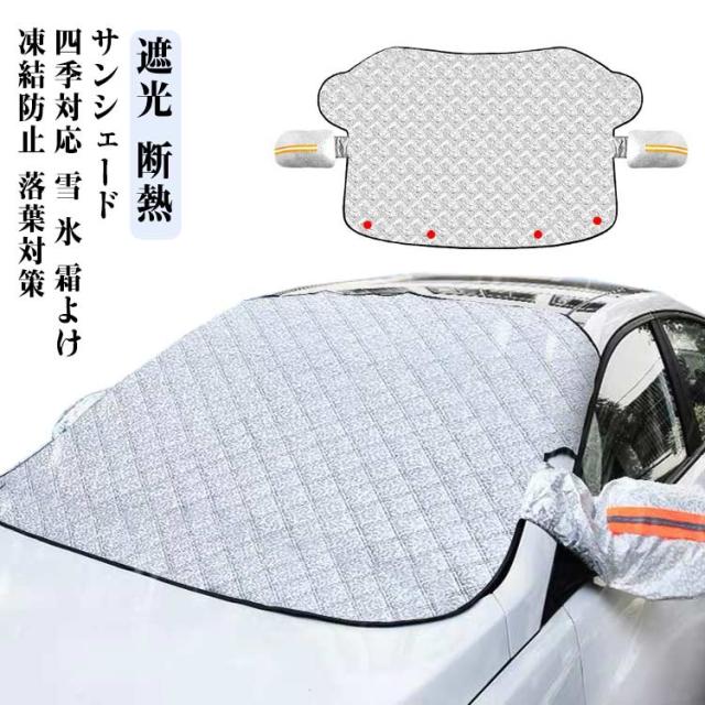 | サンシェード 遮光 断熱 四季対応【雪 氷 霜よけ 凍結防止 落葉対策】 強力なを採用し、しっかりと密着して安定性が高いです。 内蔵だから、ご愛車を傷つける心配はありません。 固定用の耳があって、簡単に取り付けることができ、盗難防止もできます。 サイドミラーに引っ掛けることができて、ズレや風とびを心配する必要もありません。 車内の温度を軽減し、エアコンへの負荷がへり、省燃費が向上します。 一年中に使用可能です、様々なシーンに大活躍です。 春には防風防塵、夏には日焼け防止、防雨、紫外線防止、秋には落ち葉・鳥糞を避け、冬には積雪凍結防止します。 夜光設計:サイドミラー部分には反射材付き、夜間に光るのてどこに車があるかわかりやすい。 取り付け: 1.外側からフロントガラスにカバ-をかけます。 2.両サイドのミラーに取り付けます。 3.両サイドの耳をドアに挟んでドアを閉めます。 4.完成です。 | |