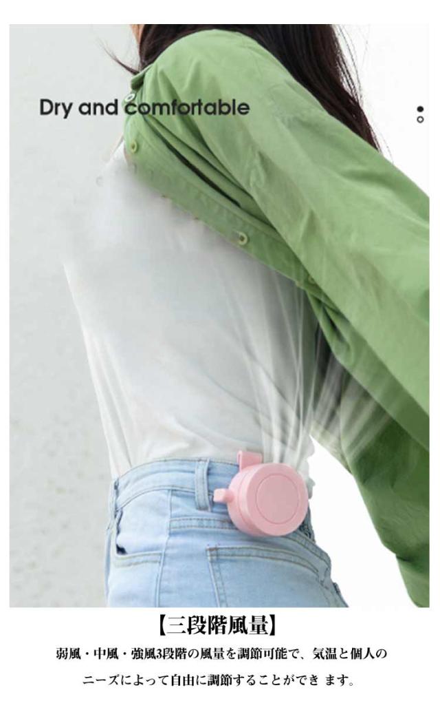| デスクにも腰にも!マルチに使えるミニ扇風機です。 【クリップ式】ミニサイズの扇風機は、襟・バッグ・ショルダーストラップ・ベルト等に挟むことができるので、携 帯便利使用簡単です! 【静音設計】低騒音設計で、オフィスなど静かな環境でもストレスなく快適に使用でき、静かで優しい風を感じながら、より仕事や勉強に集中できます。 【均一送風】コンパクトなのに強力な風量を実現!強風モードで猛暑でもより強力、より涼しい風を楽しめると同時 に、低騒音も実現! 【三段階風量】弱風・中風・強風3段階の風量を調節可能で、気温と個人のニーズによって自由に調節することができ ます。 【360°風向回転】機体は360°回転可能のデザインにより、機体を回すと風向も360°に回転させます。 【超軽量&小型】いつでもどこでも、持つ必要がないので、手が自由になり快適に使用できます。超軽量により首への負担はほとんどないです。 | |