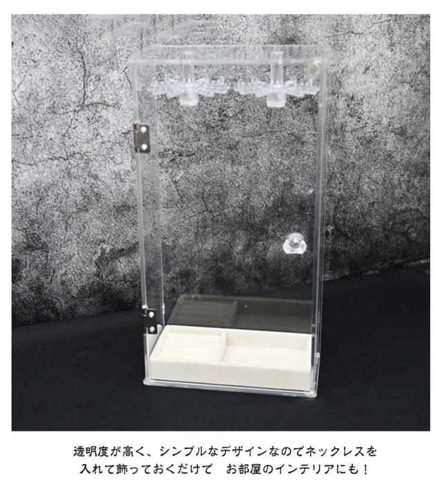 | アクリルケース。ネックレスが絡まずに収納出来るだけじゃないっ!お気に入りのジュエリーを、飾って、見せて、便利に収納! 扉式なのでネックレスの出し入れも楽々!扉の取っ手を軽く押し上げると扉が開きます。 フックは回転するので、奥に吊るしたものも取り出しやすくなってます! 素材は無色・高透明度のアクリル製なので、アクセサリーを見せながら収納できインテリアとして最適です。 透明度が高く、シンプルなデザインなのでネックレスを入れて飾っておくだけで お部屋のインテリアにも! | |