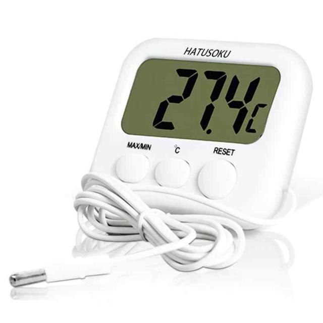【外部センサー付き温度計】離れた場所を測定できる外部センサー付きの温度計です。コードの先についた温度センサーで温度を測定します。
