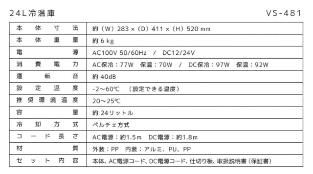 ベルソス 24L冷温庫 VS-481BK ブラック ポータブル 小型 保冷保温ボックス 保冷庫 保温庫 ペルチェ式 AC/DC 2電源 家庭 車載対応