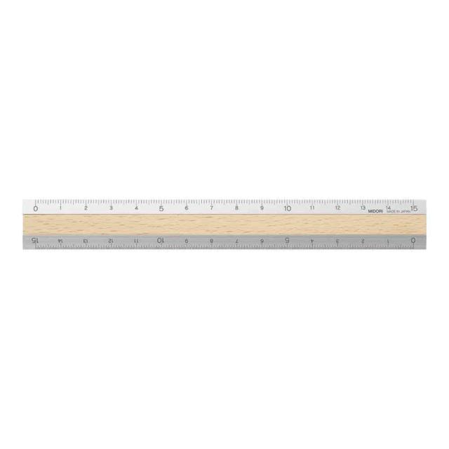 丈夫なアルミと、ナチュラルな天然木を使用した15cm定規。