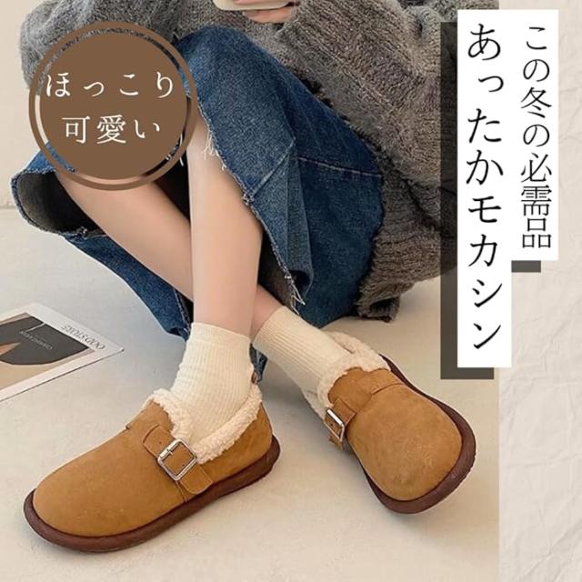 デザイン性: クラシックな丸いつま先とシンプルなデザインが、どんなスタイルにも合わせやすいモカシンです。ベルトと白いボアがワンポイントになっていて見た目にも暖かく、可愛らしい印象。