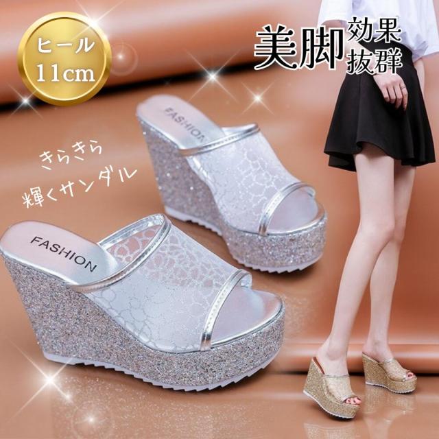 [ALVEIN] サンダル 厚底 シースルー ミュール ウェッジソール ラメ レディース ヒール グリッター キャバサンダル パーティ 歩きやすい 透け感 夏ギフト