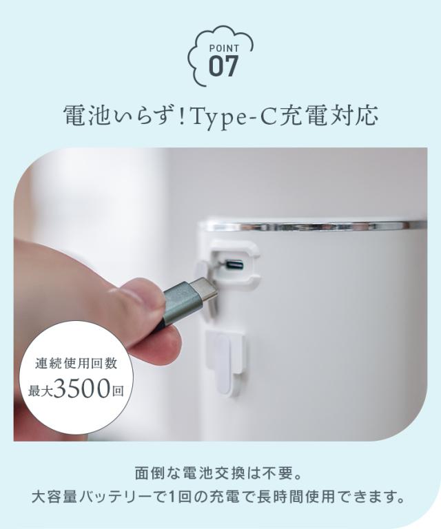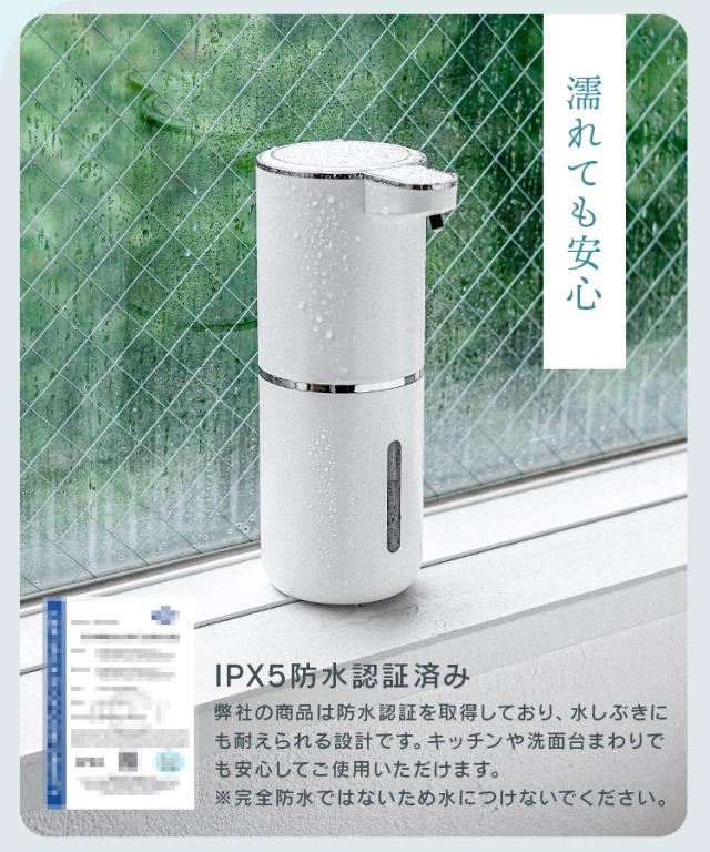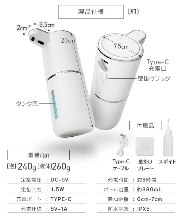 充電ポート:TYPE-C USB 充電時間:約3時間 連続使用回数:最大3500回 センサー感知距離:1〜7cm センサー感知角度:30° 吐出量:4段階調整(0.3/0.8/1.5/2秒) タンク容量:380ml 防水レベル:IPX5 |