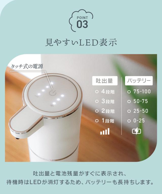 LEDディスプレイには吐出量とバッテリー残量が表示され、一目で状態を確認可能。
