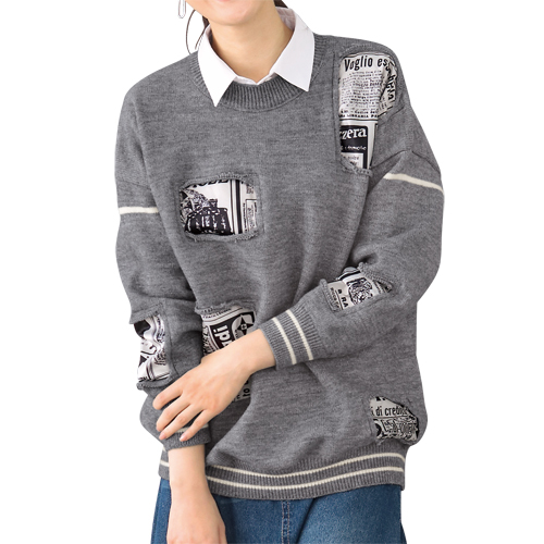 新聞風のプリントをのぞかせた遊び心満載のゆったりセーター。