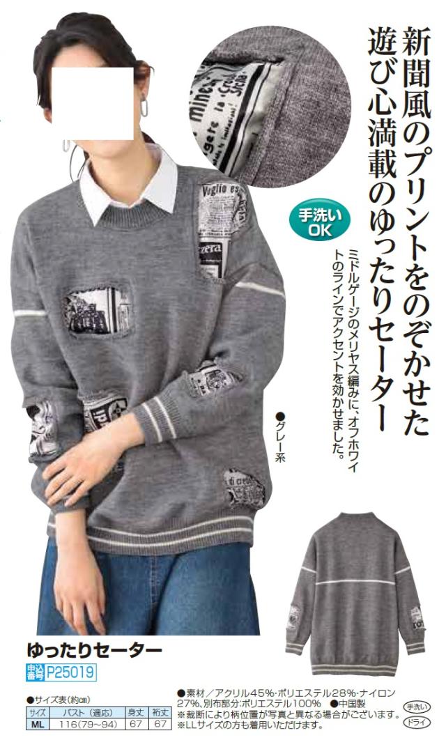 ゆったりセーター 英字新聞風デザイン グレー系 ニット セーター クルーネック レディース 婦人服 ミセス シニア 女性 丸首 つぎはぎ風 パッチワーク オシャレ トラッド ライン シニアファッション 40代 50代 60代 70代 80代 90代 母の日 お母さん 秋冬 nss p25019