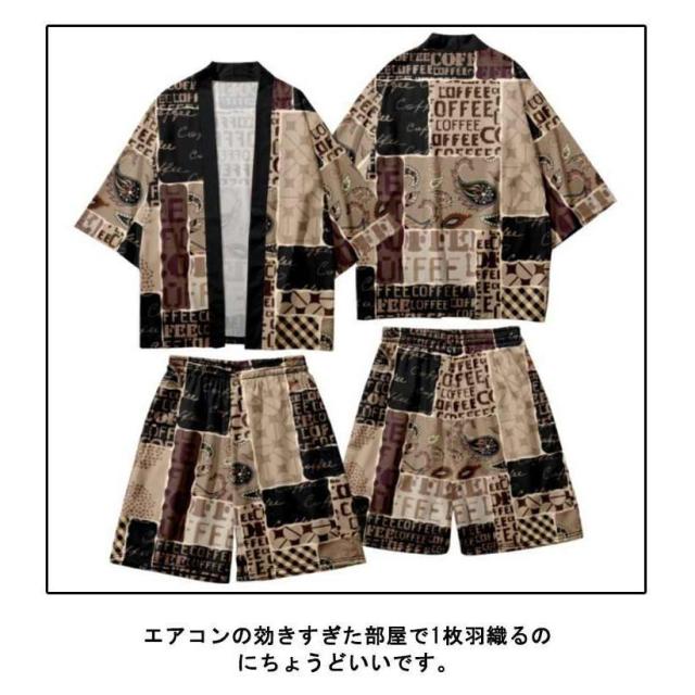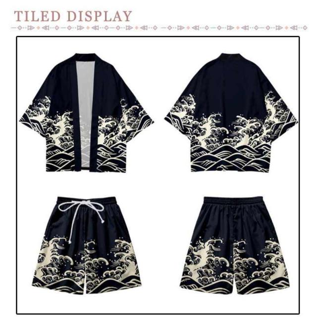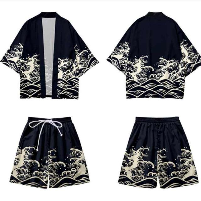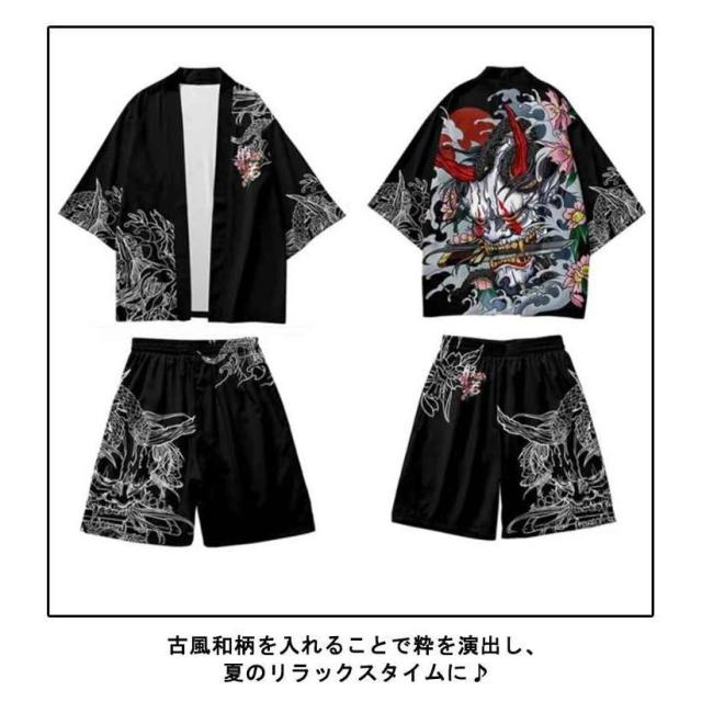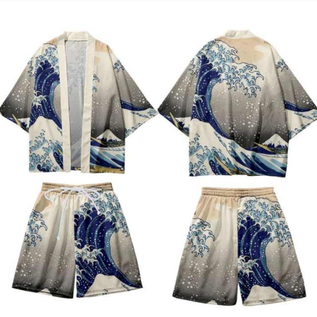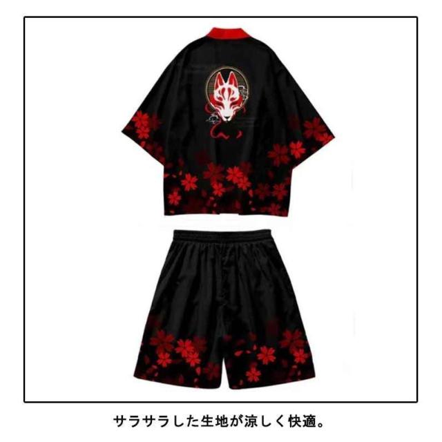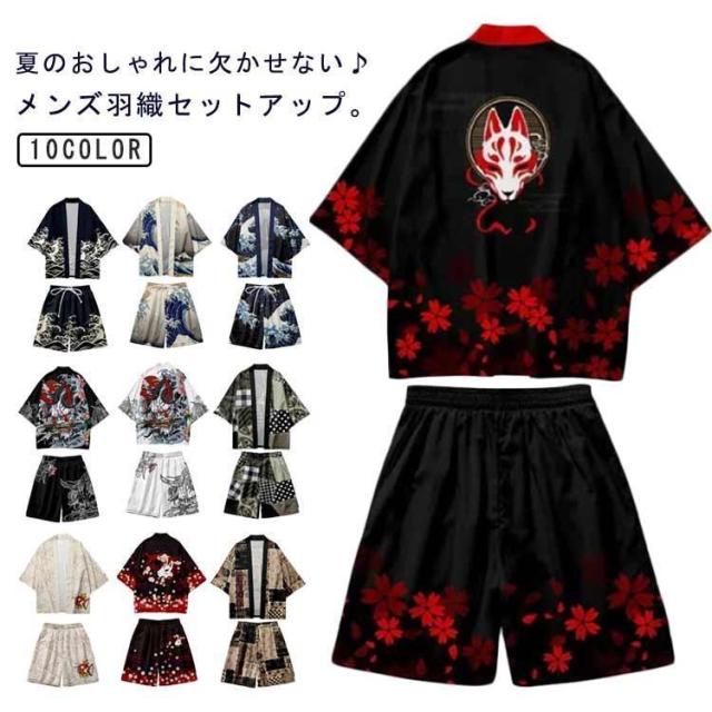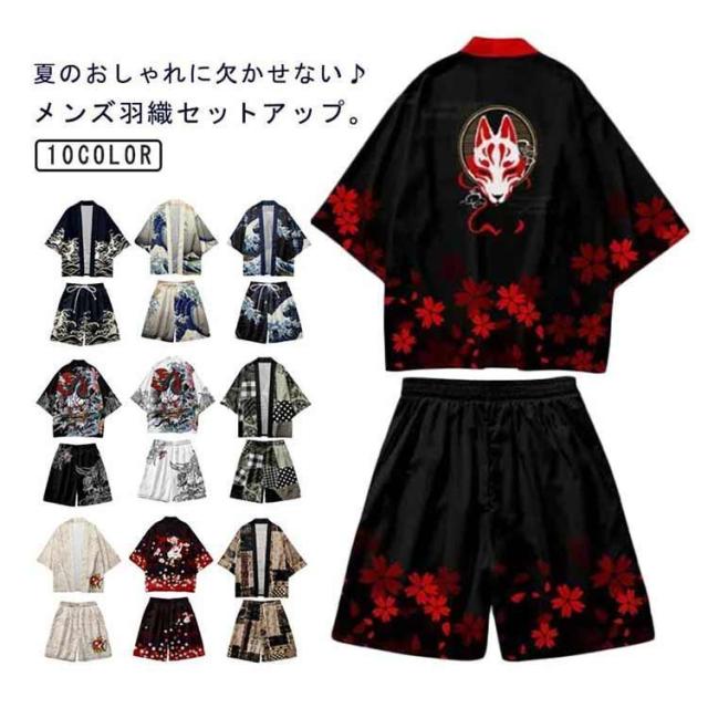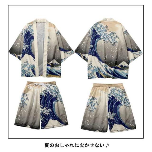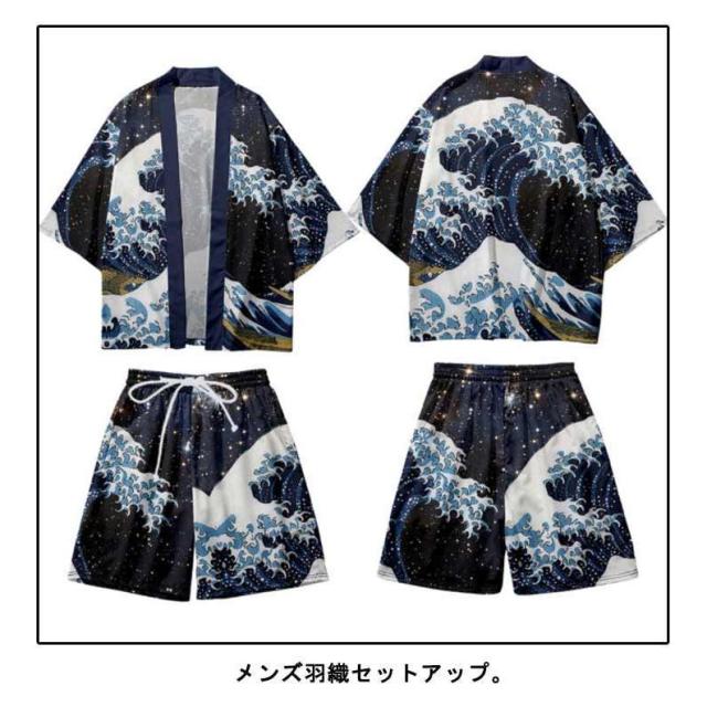 メンズ夏上下セット セットアップ 半被 甚平 はっぴ ショートパンツ 和 法被 カーディガン 浴衣 おしゃれ 和柄 着物 荒波 海 半纏 じんべ