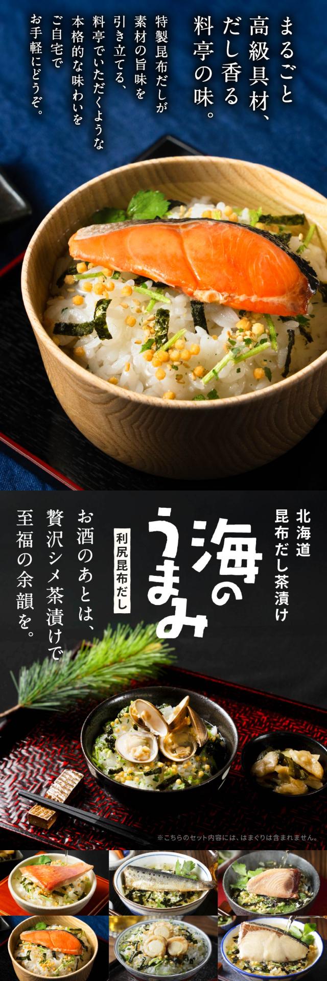 | 商品説明 | 当店で大人気のオリジナル珍味「酒のための海のつまみ」シリーズから次なる人気商品の登場!特製昆布だしが素材のうまみを引き立てます。厳選された自慢のお茶漬6種、金目鯛・いわし塩焼・まぐろ・鮭・帆立・ぶりを詰め合わせました。北海道のうまみが贅沢に詰まったお茶漬けです。お酒のあとは、シメ茶漬けで至福の余韻…お腹がすいた時には手軽に本格的な高級茶漬けをお召し上がりください。 |