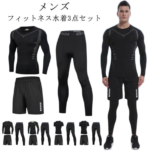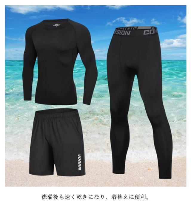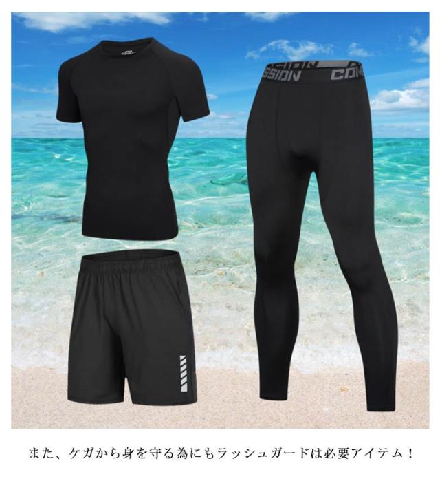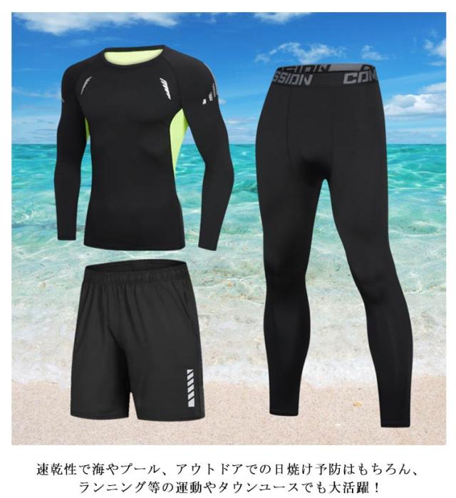 3点セット メンズ フィットネス水着 ラッシュガード 日焼け防止 半袖 長袖 サーフパンツ 吸汗 ロングパンツ 水着 UVカット 速乾 水着 おしゃれ 上下セット スポーツ スイムウェア 練習用 競泳水着 海パンツ ジム 水泳 着脱簡単 大人