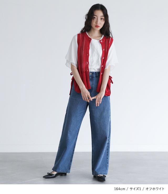 23日最大1200円クーポン 『フレア袖レースデザインカットソー』※メール便可※【10】[カットソー 半袖 五分袖 レディース トップス Tシャツ ブラウス フレア袖 レース 二の腕カバー 春 夏]