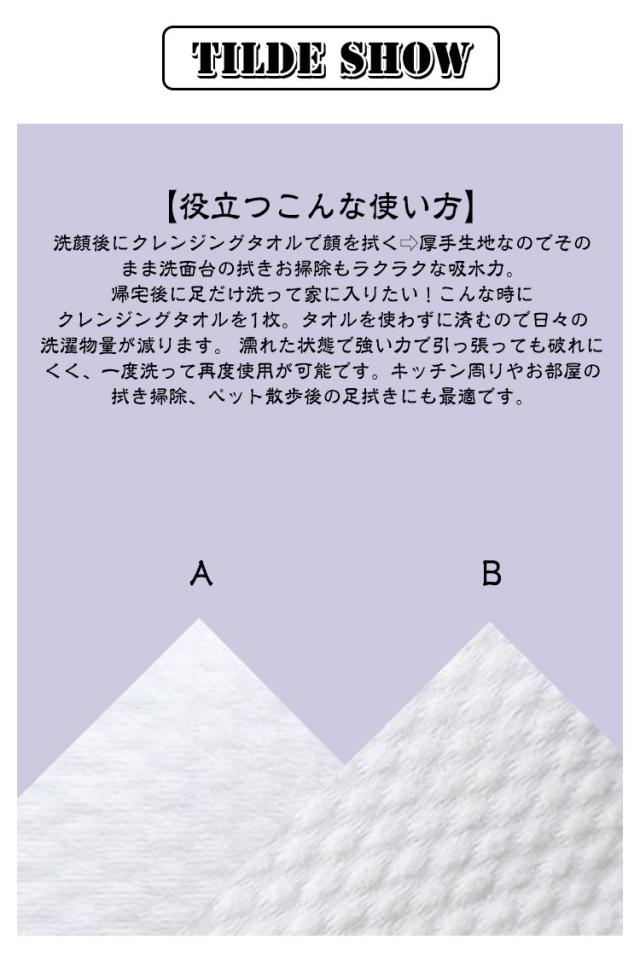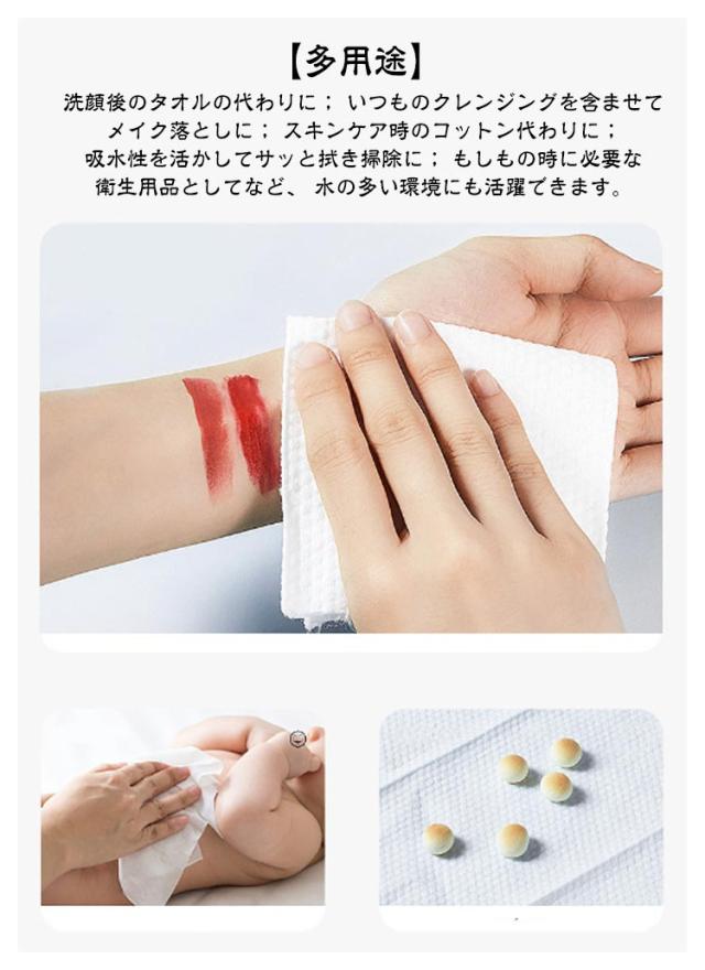 | 【26*30cm】大きいサイズの使い捨てフェイスタオル。【エンボス加工】【50枚x4個セット】 【敏感肌に嬉しい100%天然コットン】クレンジングタオルはお肌に優しい100%天然コットン繊維を使用。大人の敏感肌にはもちろん、赤ちゃんにもお使い頂けます。【サイズ】約26*30cm 【内容量】50枚入×4個(計200枚) 【強靭で吸水力抜群】 エンボス加工により、肌触りを柔らかく、吸水性をアップさせました。 瞬時に程よい水分を吸水し、肌表面の水分を取り過ぎず乾燥しにくい。 普段お使いの化粧水や美容液を含ませてパックのように使用するのもおすすめです。 厚手の生地で適度な弾力感があり、汚れが落ちやすいです。 【多用途】 洗顔後のタオルの代わりに; いつものクレンジングを含ませてメイク落としに; スキンケア時のコットン代わりに; 吸水性を活かしてサッと拭き掃除に; もしもの時に必要な衛生用品としてなど、 水の多い環境にも活躍できます。 【地球環境にやさしい】 衛生的に使うための使い捨てタイプですが 微生物の力では分解できないシリコンや化学物質を含まない為、環境負荷が極めて小さい製品です。 【役立つこんな使い方】洗顔後にクレンジングタオルで顔を拭く?厚手生地なのでそのまま洗面台の拭きお掃除もラクラクな吸水力。 帰宅後に足だけ洗って家に入りたい!こんな時にクレンジングタオルを1枚。タオルを使わずに済むので日々の洗濯物量が減ります。 濡れた状態で強い力で引っ張っても破れにくく、一度洗って再度使用が可能です。キッチン周りやお部屋の拭き掃除、ペット散歩後の足拭きにも最適です。 | |