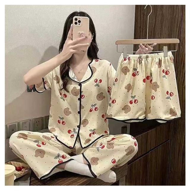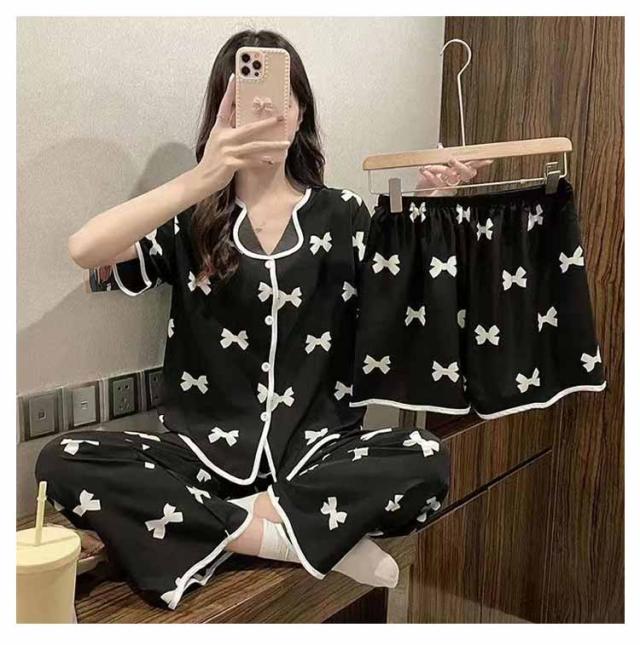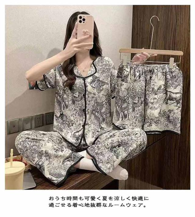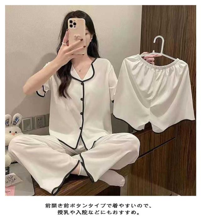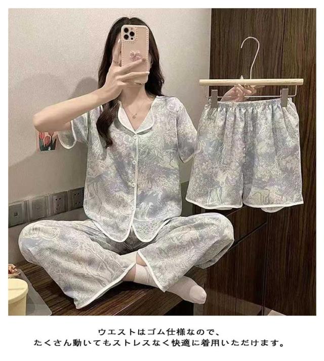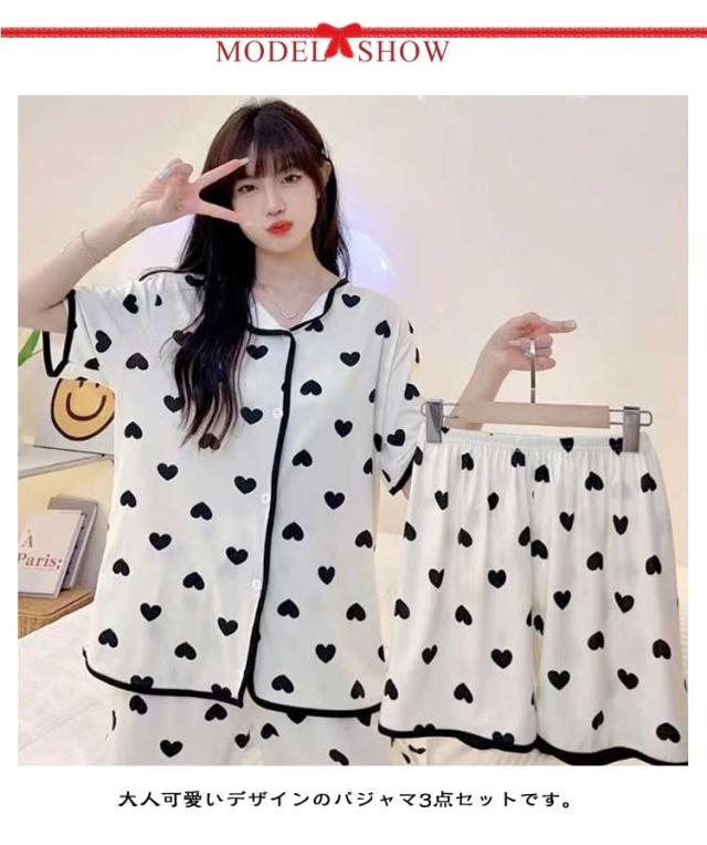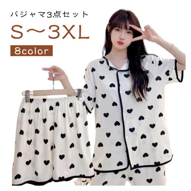 上下セット 【3点セット】半袖 ルームウェア パジャマ 部屋着 シャツ 涼しい レディース 大きいサイズ かわいい 前開き ナイトウェア 女性 【3点セット】半袖 婦人用 女の子 ショートパンツ ウエストゴム 夏 ズボン ロングパンツ 寝巻き