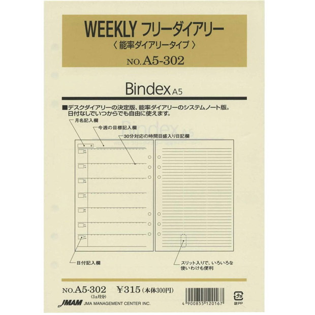 【楽天1位】システム手帳 A5 リフィル フリーダイアリー 週間 ウィークリー バインデックス A5-302 ビジネスに最適なデスクサイズ 【ネコポス便対応】