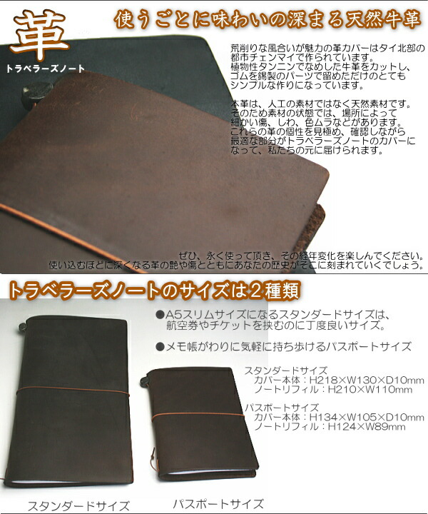 | 牛革製の手帳カバーと無罫リフィルがセットになったトラベラーズノートのスターターキットです。エアチケットが入るA5スリムサイズ。使い込むごとに味の出るカバーとシンプルなノートは、カスタマイズしやすく使い込むと味わいをまします! 使い方も簡単で、趣味に、仕事に、日記に、スケッチにお使いいただけます。 |