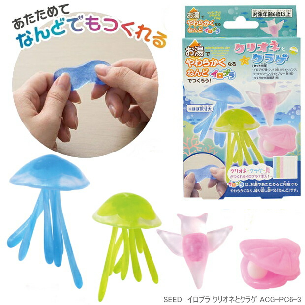 | 夏休みの宿題に工作にも使えるお湯でやわらかくなる粘土 イロプラ お湯でやわらかくなるねんどイロプラに、いきものが作れるキットができました!イロプラでかわいい海のいきものを作ってみませんか? クラゲブルー、クラゲグリーン、クリオネ、貝が作れます ネットで話題のお湯であたためて自由に形が作れる不思議なねんどイロプラ。 あたためて何度もつかえて、色混ぜもOK、学校の自由研究や工作に、お手製アクセサリー作りやスイーツデコ製作、型取り用にも◎ |