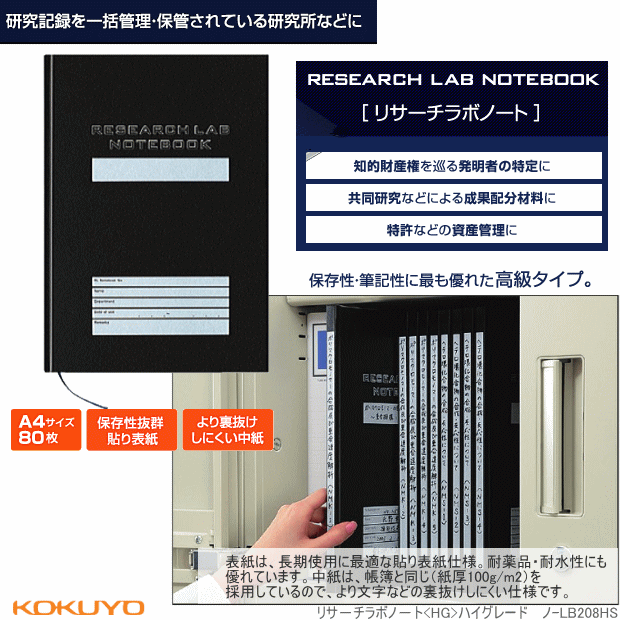 研究者が研究活動の内容を自ら整理・記録し、第三者による確認を取るための研究記録用ノート。研究者の貴重な財産になると共に、研究成果を知的財産権として保護する際の、重要な証拠資料にもなりえます。
