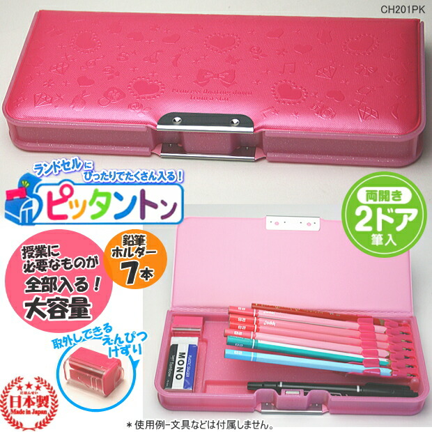 | ランドセル横向収納サイズの筆箱。最薄型で収納性はたっぷりな大容量、2ドアコンパクト筆入れピッタントン。小学校で必要なものが全部入ります! 表紙にはハート、音符、ダイヤ、星柄などの型押し、本体にはラメの入ったかっこいい筆箱 ラメプックリ筆入れ |