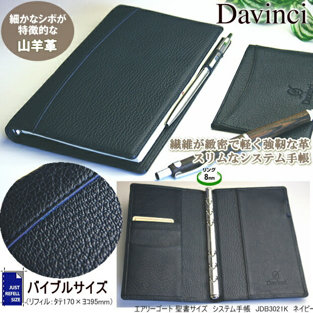 スリムなシステム手帳 本革 バイブル リング径8mm ネイビー 紺 ゴートレザー B6 聖書サイズ 6穴 ダヴィンチ JDB3021K