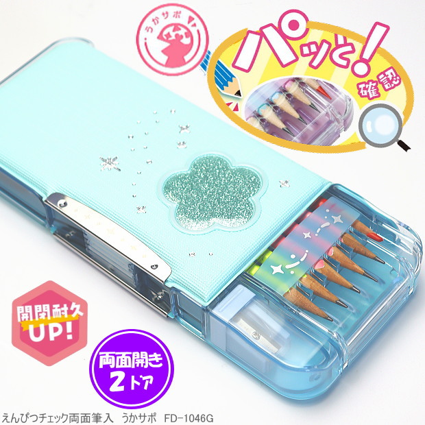 えんぴつチェック両面筆入れ 小学校女子におすすめの筆箱 かわいいラメ入り 大容量 2ドア筆箱 薄緑